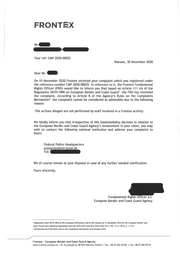 "content": "FRONTEX Your ref: CMP-2020-00022 Warsaw, 30 November 2020 Dear M r . - On 19 November 2020 Frontex received your complaint which was registered under the reference number CMP-2020-00022. In reference to it, the Frontex Fundamental Rights Officer (FRO) would like to inform you that based on Article 111 (4) of the Regulation 2019 / 1896 on European Border and Coast Guard 1 the FRO has reviewed the complaint. According to Article 8 of the Agency's Rules on the Complaints Mechanism 2 the complaint cannot be considered as admissible due to the following reason: -The actions alleged are not performed by staff involved in a Frontex activity. We kindly inform you that irrespective of this inadmissibility decision in relation to the European Border and Coast Guard Agency's involvement in your claim , you may wish to contact the following national institution and address your complaint to them: Federal Police Headquarters ~ Tel:~ We of course remain at your disposal in case of any further needed clarification . Yours sincerely, Fundamental Rights Officer a. i. European Border and Coast Guard Agency 1 Regulation (EU) 201911896 of tile European Parliament and of th e Council of 13 November 2019 011 the European Border and Coast Guard and repealing Regulations (EU) No 1052/2013 and (EU) 2016/1624 (OJ L 295, 11 . 11 .2019, p. 1- 131). 1 ED Decision No R-ED-2016 - 106 on the Comp laints Mechanism of 6 October 2016. Frontex - European Border and Coast Guard Agency www.frontex.europa. eu I Pl. Europejski 6, 00-844 Warsaw, Poland I Tel. +48 22 205 95 00 I Fax +48 22 205 95 01",