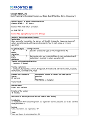 "content": "SESSION TEMPLATE Basic Training for European Border and Coast Guard Standing Corps (Category 1) Module: MODULE 4: Border checks and return Chapter: BC&R 11 2.7 Return Session: BC&R 11/3 Return operations M1 S1(8 )C2.7.3 Session 1(8): types phases procedures (theory) Session 1: Return Operations (Theory) Session Aim: Upon successful completion the learner will be able to describe types and phases of return operations and outline procedures carried out in each phase of a return operation. Chapter/Subject Learning outcomes 2.7.3 8 Describe phases and types of return operations (K) Return Operations 2.7.3 9 Summarise roles and responsibilities of main participants and Return stakeholders involved in return operations (K) Operations Training environment and facilities: 1 classroom (U shape) Training equipment: 1 computer, 1 projector, pointer, 1 flipchart, 1 whiteboard, kit with markers, magnets, sticky notes, coloured cards, tape Planned max. number of Planned min. number of trainers and their specific learners expertise: 20 learners 1 FRONTEX EL or Multiplier Trainer needs Learner needs Paper, pen, markers Duration of the session 45 minutes Description of learning activities and the time for each activity Introduction An introduction of the session to present and explain the learning outcomes and all the activities to be performed. 5’ Lecture Tutor presentation and explanation. 15’ Topic: Types and phases of return operations (K)",