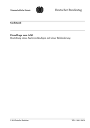 "content": "Wissenschaftliche Dienste Sachstand Seite 2 WD 6 - 3000 - 050/18 Einzelfrage zum AGG Bestellung eines Sachverständigen mit einer Behinderung Aktenzeichen: WD 6 - 3000 - 050/18 Abschluss der Arbeit: 23. Mai 2018 Fachbereich: WD 6: Arbeit und Soziales Die Wissenschaftlichen Dienste des Deutschen Bundestages unterstützen die Mitglieder des Deutschen Bundestages bei ihrer mandatsbezogenen Tätigkeit. Ihre Arbeiten geben nicht die Auffassung des Deutschen Bundestages, eines sei- ner Organe oder der Bundestagsverwaltung wieder. Vielmehr liegen sie in der fachlichen Verantwortung der Verfasse- rinnen und Verfasser sowie der Fachbereichsleitung. Arbeiten der Wissenschaftlichen Dienste geben nur den zum Zeit- punkt der Erstellung des Textes aktuellen Stand wieder und stellen eine individuelle Auftragsarbeit für einen Abge- ordneten des Bundestages dar. Die Arbeiten können der Geheimschutzordnung des Bundestages unterliegende, ge- schützte oder andere nicht zur Veröffentlichung geeignete Informationen enthalten. Eine beabsichtigte Weitergabe oder Veröffentlichung ist vorab dem jeweiligen Fachbereich anzuzeigen und nur mit Angabe der Quelle zulässig. Der Fach- bereich berät über die dabei zu berücksichtigenden Fragen.",