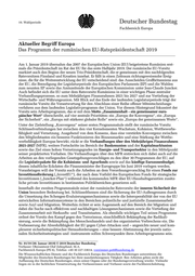 "content": "19. Wahlperiode Fachbereich Europa Aktueller Begriff Europa Das Programm der rumänischen EU-Ratspräsidentschaft 2019 Am 1. Januar 2019 übernahm das 2007 der Europäischen Union (EU) beigetretene Rumänien erst- mals die Präsidentschaft im Rat der EU für das erste Halbjahr 2019. Der rumänische EU-Vorsitz markiert auch den Beginn der neuen Trio-Präsidentschaft, die er gemeinsam mit den nachfolgenden Ratsvorsitzen Finnland und Kroatien innehat. Er fällt in einen Zeitraum richtungsweisender Ereig- nisse, die für die Weiterentwicklung der EU entscheidend sind: das Ausscheiden Großbritanniens aus der EU, die Beendigung der Legislaturperiode des Europäischen Parlaments (EP) und die Wahlen zum neunten EP sowie das Amtszeitende der Europäischen Kommission unter Jean-Claude Juncker. Auch befindet sich die EU unter dem Ratsvorsitz Rumäniens in einer wichtigen Phase zentraler Verhandlungsprozesse, so zum Mehrjährigen Finanzrahmen 2021 bis 2027 und zur Vertiefung der Wirtschafts- und Währungsunion. Mit Blick auf das Ende der laufenden Legislaturperiode trägt der rumänische Vorsitz die Verantwortung für den Abschluss einer Reihe offener Mitentscheidungs- verfahren aus dem laufenden Legislativprogramm der Union. Vor diesem Hintergrund fokussiert der Vorsitz sein Arbeitsprogramm, das er mit dem Motto „Zusammenhalt – ein gemeinsamer euro- päischer Wert“ überschreibt, auf vier zentrale Prioritäten: ein „Europa der Konvergenz“, ein „Europa der Sicherheit“, ein „Europa mit stärkerer globaler Rolle“ sowie ein „Europa der gemeinsamen Werte“. Unter der Zielstellung „Konvergenz“ seiner ersten Programmsäule stellt der rumänische Vorsitz Schlüsselverbindungen her zwischen den vier Kernelementen Wachstum, Kohäsion, Wettbewerbs- fähigkeit und Vernetzung. Ausgehend von dem Konsens, dass eine verstärkte Konvergenz zwischen den Mitgliedstaaten ein besseres Funktionieren des Binnenmarkts und eine Stärkung der Wettbe- werbsfähigkeit Europas bewirkt, rückt er die Verhandlungen über den Mehrjährigen Finanzrahmen 2021-2027 (MFR), weitere Fortschritte im Bereich der Bankenunion und der Kapitalmarktunion sowie das Ziel eines hohen Vernetzungsgrades im Energie- und Transportsektor in den Mittelpunkt seiner projektierten Vorhaben. Die Verhandlungen über den MFR erstrecken sich dabei auch auf die Arbeiten an den vorliegenden Gesetzgebungsvorschlägen zu den über 30 Programmen der EU, auf die Legislativpakete für die Kohäsions- und Agrarfonds sowie auf das künftige Eurozonenbudget, dessen inhaltliche Eckdaten die Finanzminister der Eurogruppe bis Juni 2019 vorlegen werden. Voranbringen will der Vorsitz auch die Arbeiten an dem Verordnungsvorschlag für einen Fonds zur Investitionsförderung („InvestEU“), der nach dem Vorbild des Europäischen Fonds für strategische Investitionen („Juncker-Plan“) während des kommenden MFR über EU-Haushaltsgarantien zusätz- liche private Investitionen in bestimmten Politikbereichen generieren soll. Innerhalb der zweiten Programmsäule misst der rumänische Ratsvorsitz der inneren Sicherheit der Union besondere Bedeutung bei. Schlüsselthemen sind die Sicherung der EU-Außengrenzen durch die Umsetzung des Schengen-Evaluierungsmechanismus sowie die Interoperabilität der von der EU entwickelten Informationssysteme in den Bereichen polizeiliche und justizielle Zusammenarbeit sowie Asyl und Migration. Weiterhin richtet er sein Augenmerk auf den Bereich der Migration und dabei die Suche nach effektiven und nachhaltigen Lösungsmechanismen sowie die Vertiefung der Zusammenarbeit mit Herkunfts- und Transitstaaten. Als ebenfalls wichtigen Teil seines Programms ordnet der Vorsitz den Kampf gegen den Terrorismus, einschließlich Bekämpfung der Radikali- sierung, sowie die Bekämpfung des Menschenhandels und des organisierten Verbrechens ein. Die Verbesserung der Abwehrfähigkeit der EU gegen Cyber-Attacken und – angesichts neuer und kom- plexerer sicherheitspolitischer Herausforderungen – eine bessere Abstimmung der jeweils natio- nalen Sicherheitsstrategien und -instrumente sollen Schwerpunkte ihres Arbeitsprogramms sein. Nr. 01/19 (30. Januar 2019) © 2019 Deutscher Bundestag Verfasser: Oberamtsrat Olaf Zehnpfund, M.A. Fachbereich Europa (PE 6), Telefon: +49 30 227-33614, vorzimmer.pe6@bundestag.de Die Wissenschaftlichen Dienste und der Fachbereich Europa des Deutschen Bundestages unterstützen die Mitglieder des Deutschen Bundestages bei ihrer mandatsbezogenen Tätigkeit. Ihre Arbeiten geben nicht die Auffassung des Deutschen Bundestages, eines seiner Organe oder der Bundestagsverwaltung wieder. Vielmehr liegen sie in der fachlichen Verantwortung der Verfasserinnen und Verfasser sowie der Fachbereichsleitung.",
