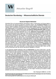 "content": "Aktueller Begriff Deutsche Digitale Bibliothek Kulturelles Erbe und wissenschaftliche Informationen sollen in Deutschland und Europa digital er- fasst und über das Internet für jedermann erreichbar werden. Der europäische Rahmen ist mit der Einrichtung der digitalen Bibliothek europeana.eu bereits gegeben: Das Portal, im Rahmen der Initiative „i2010“ vorbereitet und entwickelt, ist Ende 2008 in Betrieb gegangen. Gleichzeitig haben viele Mitgliedstaaten der Europäischen Union mit der Digitalisierung von Kultursammlungen und Bibliotheken begonnen. Deutschland hat dazu die Deutsche Digitale Bibliothek (DDB) konzipiert. Eingebettet in das Netzwerk von Europeana soll das Projekt von Bund und Ländern gemeinsam betrieben werden. Die digitale Bibliothek soll zu einer öffentlichen Kulturplattform werden, die allen Kulturinteressierten einen Zugang zur Kultur vermittelt. Ein wesentliches Ziel ist es, das digi- tal verfügbare Angebot bedeutender Kultur- und Wissenschaftseinrichtungen in Deutschland und Europa zusammenzuführen und multimedial zu vernetzen. Alle Arten von kulturellen und wissen- schaftlichen Materialien aus allen Kultur- und Wissenschaftseinrichtungen sollen so miteinander verknüpft werden, dass ein gänzlich neues Nutzungspotential entsteht. Zugleich soll eine Lang- zeitarchivierung der digitalen Kopien sichergestellt werden, so dass diese auch durch künftige Ge- nerationen nutzbar sind. Weiteres Ziel ist die Schaffung einer wissenschaftlichen Expertenplatt- form, die Wissenschaft, Bildung und Wirtschaft für den Informationsaustausch zur Verfügung stellt und dazu beitragen kann, wissenschaftliche Erkenntnisse zügig in marktfähige Produkte und Dienstleistungen umzusetzen. Die Deutsche Digitale Bibliothek steht so auch im Wettbewerb mit ähnlichen Einrichtungen in anderen Staaten. Neben kultur- und wissenschaftspolitischen Zielset- zungen sprechen nicht zuletzt wirtschafts- und außenpolitische Argumente dafür, Kultur und Wis- sen aus Deutschland über das Internet international zugänglich zu machen. In der Deutschen Digitalen Bibliothek sollen die Datenbanken von über 30.000 Kultur- und Wis- senschaftseinrichtungen in Deutschland vernetzt und durch spezielle Suchwerkzeuge erschlossen werden. Geplant ist, die Bestände von Bibliotheken, Archiven, Museen, Mediatheken sowie Kultur- denkmale in der DDB zugänglich zu machen. Technologisch fortgeschrittene Recherche- und Präsentationstechniken sollen eine übergreifende, multilinguale Suche in den Datenbeständen der Kultur- und Wissenschaftseinrichtungen ermöglichen. Dies erfordert technische Vorkehrungen, die ein modernes Wissensmanagement in Form einer interaktiven Navigation ermöglichen. Gefragt sind kontextbezogene Suchmöglichkeiten mit hoher Treffgenauigkeit und attraktiver multimedialer Präsentation der Suchergebnisse. So werden gegenwärtig neue Technologien für den Aufbau von multimedialen Wissensplattformen im Rahmen des vom Bundesministerium für Wirtschaft und Technologie (BMWi) geförderten Projekts „Theseus“ entwickelt. Theseus ist ein vom BMWi initi- iertes Forschungsprogramm mit dem Ziel, eine neue internetbasierte Wissensinfrastruktur zu ent- wickeln, um das Wissen im Internet besser zu nutzen und zu verwerten. Besonders relevant für die digitale Bibliothek ist das Anwendungsszenario CONTENTUS, das auf die Schaffung eines auto- matisierten Prozesses zur Bereitstellung von multimedialem Wissen abzielt. Damit können kul- turelle Einrichtungen von der kostengünstigen Verarbeitung großer multimedialer Bestände, einer rechtssicheren Bereitstellung ihrer Inhalte und von einer engen Vernetzung mit anderen Inhalte- anbietern aus Kultur und Wissenschaft profitieren. Korr. Fassung. Nr. 66/09 (28. Juli 2009) ________________________________________________________________________________________________ Das Dokument gibt nicht notwendigerweise die Auffassung des Deutschen Bundestages oder seiner Verwaltung wieder und ist urheberrechtlich geschützt. Eine Verwertung bedarf der Zustimmung durch die Leitung der Abteilung W.",