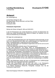 "content": "Landtag Brandenburg Drucksache 5/1345 5. Wahlperiode Antwort der Landesregierung auf die Kleine Anfrage Nr. 365 der Abgeordneten Henryk Wichmann und Sven Petke Fraktion der CDU Drucksache 5/950 Polizeiwache Angermünde Wortlaut der Kleinen Anfrage Nr. 365 vom 03.05.2010: In den 50 Polizeiwachen des Landes Brandenburg verrichten die Bediensteten der Polizei des Landes Brandenburg ihren Dienst zur Abwehr von Gefahren und zum Schutz der Bevölkerung vor Kriminalität. Wir fragen die Landesregierung: 1. a) Wie viele Polizeibedienstete sind in der Polizeiwache Angermünde tätig und wie hoch ist ihr Altersdurchschnitt? (Bitte nach Laufbahngruppen und Organisationsein- heiten; Polizeibedienstete im Überhang sind auch auszuweisen) b) Wie viele Bedienstete der Polizeiwache Angermünde sind bis 30, bis 40, bis 50 und über 50 Jahre alt? c) Wie viele Bedienstete bekleiden davon Führungspositionen? 2. Wie viele Bürgerinnen und Bürger leben im Zuständigkeitsbereich der Polizeiwache Angermünde und welche Fläche umfasst ihr Zuständigkeitsbereich? 3. a) Wie gestaltet sich die Dienstzeit (Art des Arbeitszeitmodells, Anzahl der Schich- ten, Anzahl der Dienstgruppen, Personalstärke pro Schicht bzw. Pool beim flexiblen Arbeitszeitmodell, Anzahl der Revierpolizisten) in der Polizeiwache Angermünde? b) Wie hoch war jeweils der durchschnittliche Krankheitsstand der Bediensteten in den vergangenen fünf Jahren (Bitte jedes Jahr separat ausweisen)? 4. a) Wie viele Bedienstete wurden in der Polizeiwache Angermünde in den vergan- genen drei Jahren befördert und wie viele erfüllen die Voraussetzungen zur Beförde- rung? b) Wie viele Bedienstete werden seit wann im Eingangsamt ihrer Laufbahngruppe besoldet (Bitte nach Organisationseinheiten aufgliedern)? c) Wie viele Personalstellen sind seit dem Jahr 2000 in der Polizeiwache Angermünde abgebaut worden (Bitte nach Organisationseinheiten aufgliedern)? 5. a) Welche Ausstattung (Polizei-Kfz, Funkgeräte, Computer, etc.) hat die Polizeiwache Angermünde? Datum des Eingangs: 04.06.2010 / Ausgegeben: 09.06.2010",