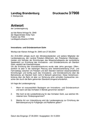 "content": "Landtag Brandenburg Drucksache 3/7908 3. Wahlperiode Antwort der Landesregierung auf die Kleine Anfrage Nr. 2949 der Abgeordneten Anita Tack Fraktion der PDS Landtagsdrucksache 3/7858 Innovations− und Gründerzentrum Golm Wortlaut der Kleinen Anfrage Nr. 2949 vom 27.08.2004: Am 23.8.2004 erfolgte durch den Ministerpräsidenten und weitere Mitglieder der Landesregierung, den Landrat Potsdam−Mittelmark, den Potsdamer Oberbürger− meister und Vertreter der Einrichtungen des Wissenschaftsparks der symbolische Spatenstich zur Errichtung des Innovations− und Gründerzentrums am Standort Golm, westlich der Eisenbahntrasse. Um die Errichtung des Innovationszentrums wurde viele Jahre gerungen. Offen− sichtlich ist aber in der bisherigen Planung eine Verkehrsverbindung (Fuß− und Fahrradweg) zwischen Uni Potsdam und dem Standort mehrerer wissenschaftlicher Einrichtungen und künftig auch des Innovations− und Gründerzentrums über die Bahnstrecke am Standort Golm nicht in Betracht gekommen. Diese Verkehrsver− bindung über die Bahn ist aber zur Sicherung einer schnellen Austausches zwi− schen den durch die Bahn getrennten Standorte dringend erforderlich. Ich frage die Landesregierung: 1. Wann ist voraussichtlich Baubeginn am Innovations− und Gründerzentrum und wann soll das Vorhaben in Betrieb genommen werden? 2. Wie hoch ist die Landesförderung für das Vorhaben Golm, aus welchen Mi− nisterien bzw. Förderprogrammen? 3. Welche Art von Unterstützung wird die Landesregierung zur Errichtung der Bahnüberquerung für Fußgänger und Radfahrer geben? Datum des Eingangs: 27.09.2004 / Ausgegeben: 04.10.2004",