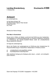 "content": "Landtag Brandenburg Drucksache 4/599 4. Wahlperiode Antwort der Landesregierung auf die Kleine Anfrage 192 des Abgeordneten Sigmar−Peter Schuldt Fraktion der DVU Drs. 4/444 Wortlaut der Kleinen Anfrage: Pkw−Maut in Deutschland Derzeit wird in Politik und Medien zunehmend die Einführung einer Autobahnbe− nutzungsgebühr für Personenkraftfahrzeuge zur Erzielung zusätzlicher Einnahmen zur Finanzierung des Bundes−Autobahn−Netzes sowie als umweltpolitisches Steuerungselement diskutiert. Ich frage die Landesregierung: Wie ist die Position der Landesregierung zur Einführung einer Autobahnmaut für Personenkraftfahrzeuge in Deutschland, insbesondere im Hinblick auf deren a) umweltpolitische Lenkungseffekte und/oder b) haushaltspolitische Gesichtspunkte? (Bitte detaillierte Darlegung bei Abwägung aller steuer−, umwelt− und rechtspoliti− schen Kriterien!) Datum des Eingangs: 07.02.2005 / Ausgegeben: 14.02.2005",