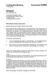 "content": "Landtag Brandenburg Drucksache 4/2565 4. Wahlperiode Antwort der Landesregierung auf die Kleine Anfrage Nr. 984 der Abgeordneten Roswitha Schier Fraktion der CDU Landtagsdrucksache 4/2449 BKK-Patienten müssen länger warten Wortlaut der Kleinen Anfrage Nr. 984 vom 25.01.2006: Der schwelende Streit zwischen Ärzten und Krankenkassen nimmt inzwischen neue Dimensionen an. So war beispielsweise in der MOZ zu lesen, dass einige Ärzte an Versicherte der Betriebs- und Innungskrankenkassen inzwischen keine Termine mehr vergeben oder die entsprechenden Patienten länger als andere Versicherte warten lassen. Das geschieht, obwohl einige der Versicherten freiwillig gesetzlich Krankenversicherte bei den Betriebs- und Innungskrankenkassen sind und teilweise mit ca. 500 Euro hohe Beiträge zahlen. Ich frage die Landesregierung: 1. Ist der Landesregierung bekannt, welche Betriebs- und Innungskrankenkas- sen ihren Verpflichtungen nicht nachkommen, und wenn ja, welche? 2. Wie wird das Land seine Rechtsaufsicht wahrnehmen und versuchen, den Streit im Interesse der GKV-Versicherten schnellstmöglich zu schlichten? Namens der Landesregierung beantwortet die Ministerin für Arbeit, Soziales, Ge- sundheit und Familie die Kleine Anfrage wie folgt: Frage 1: Ist der Landesregierung bekannt, welche Betriebs- und Innungskrankenkassen ihren Verpflichtungen nicht nachkommen, und wenn ja, welche? zu Frage 1: Die der Rechtsaufsicht des Ministeriums für Arbeit, Soziales, Gesundheit und Fami- lie (MASGF) unterstehende Innungskrankenkasse Brandenburg und Berlin ist ihren im Oktober 2005 noch bestehenden Zahlungsverpflichtungen gegenüber der Kas- senärztlichen Vereinigung Brandenburg (KVBB) inzwischen nachgekommen. Ge- genüber der ebenfalls der Rechtsaufsicht des MASGF unterstehenden Brandenbur- gischen Betriebskrankenkasse bestanden und bestehen keine offenen Forderungen seitens der KVBB. Datum des Eingangs: 23.02.2006 / Ausgegeben: 28.02.2006",