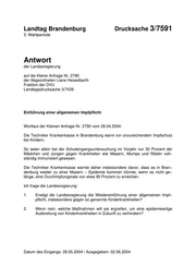 "content": "Landtag Brandenburg Drucksache 3/7591 3. Wahlperiode Antwort der Landesregierung auf die Kleine Anfrage Nr. 2790 der Abgeordneten Liane Hesselbarth Fraktion der DVU Landtagsdrucksache 3/7439 Einführung einer allgemeinen Impfpflicht Wortlaut der Kleinen Anfrage Nr. 2790 vom 28.04.2004: Die Techniker Krankenkasse in Brandenburg warnt vor unzureichendem Impfschutz bei Kindern. So seien allein bei der Schuleingangsuntersuchung im Vorjahr nur 30 Prozent der Mädchen und Jungen gegen Krankheiten wie Masern, Mumps und Röteln voll− ständig immunisiert gewesen. Die Techniker Krankenkasse warnte daher insbesondere davor, dass es in Bran− denburg wieder zu einer Masern − Epidemie kommen könnte, wenn es nicht ge− länge, eine Durchimpfungsrate von etwa 95 Prozent zu erreichen. Ich frage die Landesregierung: 1. Erwägt die Landesregierung die Wiedereinführung einer allgemeinen Impf− pflicht, insbesondere gegen so genannte Kinderkrankheiten? 2. Wenn nein, welche Maßnahmen will sie ergreifen, um eine epidemieartige Ausbreitung von Kinderkrankheiten in Zukunft zu verhindern? Datum des Eingangs: 28.05.2004 / Ausgegeben: 02.06.2004",