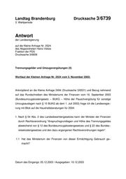 "content": "Landtag Brandenburg Drucksache 3/6739 3. Wahlperiode Antwort der Landesregierung auf die Kleine Anfrage Nr. 2524 des Abgeordneten Heinz Vietze Fraktion der PDS Drucksache 3/6606 Trennungsgelder und Umzugsvergütungen (II) Wortlaut der Kleinen Anfrage Nr. 2524 vom 3. November 2003: Anknüpfend an die Kleine Anfrage 2494 (Drucksache 3/6531) und Bezug nehmend auf das Rundschreiben des Ministeriums der Finanzen vom 16. September 2003 (Bundesumzugskostengesetz − BUKG − Höhe der Pauschvergütung für sonstige Umzugsauslagen nach § 10 BUKG ab dem 1. Juli 2003) frage ich die Landesregie− rung mit Blick auf die Haushaltsberatungen für 2004: 1. Nach § 54 Abs. 2 des Landesbeamtengesetzes kann der Minister der Finanzen durch Rechtsverordnung \"Anspruchsgrundlagen und Höhe des Trennungsgeldes abweichend von § 12 des Bundesumzugskostengesetzes und § 22 des Bundes− reisekostengesetzes und den dazu ergangenen Rechtsverordnungen regeln\". 1.1 Hat das Ministerium der Finanzen von dieser Ermächtigung Gebrauch ge− macht? Datum des Eingangs: 05.12.2003 / Ausgegeben: 10.12.2003",