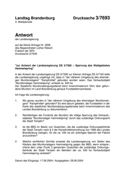 "content": "Landtag Brandenburg Drucksache 3/7693 3. Wahlperiode Antwort der Landesregierung auf die Kleine Anfrage Nr. 2836 des Abgeordneten Lothar Kliesch Fraktion der SPD Drucksache 3/7549 \"zur Antwort der Landesregierung DS 3/7390 − Sperrung des Waldgebietes Hammelspring\" In der Antwort der Landesregierung DS 3/7390 zur Kleinen Anfrage DS 3/7160 teilte die Landesregierung ungefragt mit, dass in \"der näheren Umgebung des ehemali− gen Munitionslagers\" \"Kampfmittel\" gefunden worden seien. Das Verkaufsobjekt \"Munitionslager Hammelspring\" umfasst ca. 340 ha. Der Staatliche Munitionsbergungsdienst beim Innenministerium führt über gefun− dene Munition im Land Brandenburg genaue Fundstellennachweise. Ich frage die Landesregierung: 1. Wo genau wurden in \"der näheren Umgebung des ehemaligen Munitionsla− gers\" \"Kampfmittel\" gefunden? Es wird darum gebeten, die Fundstellen in der Karte des staatlichen Munitionsbergungsdienstes beim Innenministerium des Landes Brandenburg zu dokumentieren. 2. Rechtfertigen die Fundorte der Munition die völlige Sperrung des Verkaufs− objektes \"Munitionslager Hammelspring\" durch das zuständige Ordnungsamt der Stadt Templin? 3. Ist die BBG im Besitz von Gutachten, die die zuständige Ordnungsbehörde der Stadt Templin nach § 4 der Kampfmittelverordnung von 1998 des Landes Brandenburg zwingen, für die ca. 340 ha ein sofortiges Sperren der Fläche anzuordnen? 4. Welche rechtlichen Schritte erwartet die Landesregierung von Seiten des Käufers des Munitionslagers Hammelspring gegen die BBG, wenn entspre− chend dem unter Punkt 3 genannten Gutachten die zuständige Ordnungs− behörde der Stadt Templin ein Betreten der ca. 340 ha Verkaufsobjekt Hammelspring verbietet? Datum des Eingangs: 17.06.2004 / Ausgegeben: 28.06.2004",