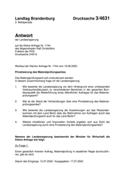 "content": "Landtag Brandenburg Drucksache 3/4631 3. Wahlperiode Antwort der Landesregierung auf die Kleine Anfrage Nr. 1744 des Abgeordneten Ralf Christoffers Fraktion der PDS Drucksache 3/4515 Wortlaut der Kleinen Anfrage Nr. 1744 vom 19.06.2002: Privatisierung des Materialprüfungsamtes Das Materialprüfungsamt soll umstrukturiert werden. In diesem Zusammenhang frage ich die Landesregierung: 1. Wie bewertet die Landesregierung vor dem Hintergrund einer umfassenden Verbraucherdiskussion zu verschiedenen Bereichen in der gesamten Bun− desrepublik die Weiterführung eines öffentlichen Auftrages für das Material− prüfungsamt? 2. Wie ist der Stand der Verhandlungen über eine Privatisierung des Material− prüfungsamtes? 3. Wie bewertet die Landesregierung die Auswirkungen auf das Ressortab− kommen mit dem Land Berlin über die Wahrnahme von Aufträgen durch das Materialprüfungsamt auch für das Land Berlin? 4. Welche inhaltlichen und finanziellen Vorteile ergeben sich aus Sicht der Landesregierung durch eine Privatisierung des Materialprüfungsamtes? Namens der Landesregierung beantwortet der Minister für Wirtschaft die Kleine Anfrage wie folgt: Zu Frage 1: Einen gesetzlich fixierten Auftrag, Materialprüfung in staatlicher Regie durchzufüh− ren, gibt es nicht. Datum des Eingangs: 12.07.2002 / Ausgegeben: 17.07.2002",