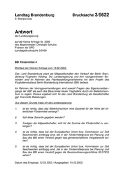 "content": "Landtag Brandenburg Drucksache 3/5622 3. Wahlperiode Antwort der Landesregierung auf die Kleine Anfrage Nr. 2099 des Abgeordneten Christoph Schulze Fraktion der SPD Landtagsdrucksache 3/5459 BBI Fördermittel 4 Wortlaut der Kleinen Anfrage vom 10.02.2003: Das Land Brandenburg plant als Mitgesellschafter den Verkauf der Berlin Bran− denburg Flughafen Holding. Die Landesregierung und ihre nachgeordneten Be− hörden sind im Rahmen des Planfeststellungsverfahrens mit dem Projekt des Flughafenneubaus Berlin Brandenburg International (BBI) befasst. Im Rahmen der Vertragsverhandlungen sind sowohl Fragen des Eigentumsüber− gangs der BBF als auch des Baus eines neuen Flughafens durch ein Bieterkonsor− tium zu regeln. Daraus ergeben sich für das Land Brandenburg als Gesellschafter ggf. finanzielle Belastungen. Aus diesem Grunde frage ich die Landesregierung: 1. Ist es richtig, dass das Bieterkonsortium eine Garantie für die Höhe der öf− fentlichen Fördermittel verlangt? 2. Soll diese Garantie gegeben werden? 3. Erwägen die Altgesellschafter, sich für die Summe der Fördermittel zu ver− bürgen? 4. Ist es richtig, dass bei der Europäischen Union bzw. Kommission zur Zeit Beschwerden anhängig sind, die in der Fördermittelpraxis bei Planung und Bau des BBI einen Verstoß gegen das gemeinschaftliche Vergaberecht se− hen? 5. Ist es richtig, dass bei der Europäischen Union bzw. Kommission zur Zeit Beschwerden anhängig sind, die in der Fördermittelpraxis bei Planung und Bau des BBI einen Verstoß gegen die Baukoordinierungsrichtlinie 93/37/EG sehen? Datum des Eingangs: 12.03.2003 / Ausgegeben: 19.03.2003",