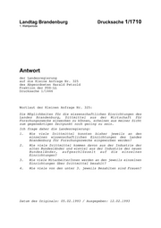 "content": "Landtag Brandenburg Drucksache 1/1710 1. Wahlperiode Antwort der Landesregierung auf die Kleine Anfrage Nr. 325 des Abgeordneten Harald Petzold Fraktion der PDS-LL Drucksache 1/1446 Wortlaut der Kleinen Anfrage Nr. 325: Die Möglichkeiten für die wissenschaftlichen Einrichtungen des Landes Brandenburg, Dittmittel aus der Wirtschaft für Forschungszwecke einwerben zu können, scheinen aus meiner Sicht zum gegenwärtigen Zeitpunkt noch gering zu sein. Ich frage daher die Landesregierung: 1. Wie viele Drittmittel konnten bisher jeweils an den einzelnen wissenschaftlichen Einrichtungen des Landes Brandenburg für Forschungszwecke eingeworben werden? 2. Wie viele Drittmittel kommen davon aus der Industrie der alten Bundesländer und wieviel aus der Industrie der neuen Bundesländer, aufgeschlüsselt auf die einzelnen Einrichtungen? 3. Wie viele MitarbeiterInnen werden an den jeweils einzelnen Einrichtungen über Drittmittel bezahlt? 4. Wie viele von den unter 3. jeweils Bezahlten sind Frauen? Datum des Originals: 05.02.1993 / Ausgegeben: 12.02.1993",