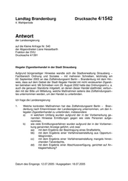 "content": "Landtag Brandenburg Drucksache 4/1542 4. Wahlperiode Antwort der Landesregierung auf die Kleine Anfrage Nr. 540 der Abgeordneten Liane Hesselbarth Fraktion der DVU Drucksache 4/1391 Illegaler Zigarettenhandel in der Stadt Strausberg Aufgrund bürgerseitiger Hinweise wandte sich die Stadtverwaltung Strausberg − Fachbereich Ordnung und Soziales − mit mehreren Schreiben, letztmalig am 02. September 2003 an das Zollfahndungsamt Berlin − Brandenburg mit dem Hin− weis, dass auf dem Gebiet der Stadt illegaler Handel mit nicht versteuerten Zigaret− ten betrieben wird. Mit Schreiben vom 29. August 2002 hatte das Ordnungsamt u. a. auch die genauen Standorte mitgeteilt, an denen dieser Handel stattfindet, verbun− den mit der Bitte um Mitteilung, welche Maßnahmen seitens des Zollfahndungsam− tes unternommen werden, um den Handel zu unterbinden. Ich frage die Landesregierung: 1. Welche konkreten Maßnahmen hat das Zollfahndungsamt Berlin − Bran− denburg nach Erkenntnissen der Landesregierung unternommen, um den il− legalen Zigarettenhandel zu unterbinden, insbesondere a) in welchem Umfang wurden aufgrund der in der Vorbemerkung ge− nannten Hinweise Ermittlungen gegen wie viele Personen aufge− nommen, b) wie viele Ermittlungsverfahren wurden aufgrund der in der Vorbemer− kung genannten Anzeige geführt, und zwar aa) mit dem Ergebnis der Beantragung eines Strafbefehls, bb) mit dem Ergebnis einer Verfahrenseinstellung aus Opportuni− tätsgründen, cc) mit dem Ergebnis einer Verfahrenseinstellung mangels hinrei− chenden Tatverdachts, dd) mit dem Ergebnis einer Abschlussverfügung, gerichtet auf An− klageerhebung? Datum des Eingangs: 12.07.2005 / Ausgegeben: 18.07.2005",