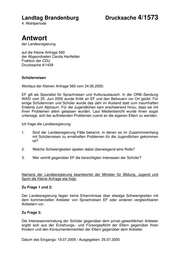 "content": "Landtag Brandenburg Drucksache 4/1573 4. Wahlperiode Antwort der Landesregierung auf die Kleine Anfrage 560 der Abgeordneten Carola Hartfelder Fraktion der CDU Drucksache 4/1439 Schülerreisen Wortlaut der Kleinen Anfrage 560 vom 24.06.2005: EF gilt als Spezialist für Sprachreisen und Kulturaustausch. In der ORB−Sendung WAS! vom 20. Juni 2005 wurde Kritik an EF und den Betreuern vor Ort geübt. Für einige Schülerinnen und Schüler wurde das Jahr im Ausland statt zum traumhaften Erlebnis zum Alptraum. Für die Jugendlichen kam erschwerend hinzu, dass sie mit ihren Problemen allein gelassen wurden. Laut Medienbericht wurde ihnen sogar untersagt, sich bei auftretenden Problemen zuerst an die eigenen Eltern zu wenden. Ich frage die Landesregierung: 1. Sind der Landesregierung Fälle bekannt, in denen es im Zusammmenhang mit Schülerreisen zu ernsthaften Problemen für die Jugendlichen gekommen ist? 2. Welche Schwierigkeiten spielen dabei überwiegend eine Rolle? 3. Wer vertritt gegenüber EF die berechtigten Interessen der Schüler? Namens der Landesregierung beantwortet der Minister für Bildung, Jugend und Sport die Kleine Anfrage wie folgt: Zu Frage 1 und 2: Der Landesregierung liegen keine Erkenntnisse über etwaige Schwierigkeiten mit dem kommerziellen Anbieter von Sprachreisen EF oder anderen vergleichbaren Anbietern vor. Zu Frage 3: Die Interessenvertretung der Schüler gegenüber dem privat−gewerblichen Anbieter ergibt sich aus der Erziehungs− und Fürsorgepflicht der Eltern gegenüber ihren Kindern und den Konsumentenrechten der Eltern gegenüber dem Anbieter. Datum des Eingangs: 19.07.2005 / Ausgegeben: 25.07.2005",