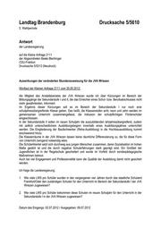"content": "Landtag Brandenburg Drucksache 5/5610 5. Wahlperiode Antwort der Landesregierung auf die Kleine Anfrage 2111 der Abgeordneten Beate Blechinger CDU-Fraktion Drucksache 5/5313 (Neudruck) Auswirkungen der veränderten Stundenzuweisung für die JVA Wriezen Wortlaut der Kleinen Anfrage 2111 vom 30.05.2012: Als Mitglied des Anstaltsbeirates der JVA Wriezen wurde ich über Kürzungen im Bereich der Bildungsgänge der Sekundarstufe I und II, die das Erreichen eines Schul- bzw. Berufsabschlusses nicht mehr gewährleisten, informiert. Im Ergebnis dieser Kürzungen soll es im Bereich der Sekundarstufe I nur noch eine schuljahresübergreifende Klasse geben. Das heißt, die Klassenstufen acht, neun und zehn werden im gemeinsamen Unterricht zusammengefasst, die Inklusion der schulpflichtigen Förderschüler eingeschlossen. In der Sekundarstufe II sollen im neuen Schuljahr die auszubildenden lehrjahresübergreifend, zudem mit zeitlich unterschiedlichem Ausbildungsbeginn innerhalb eines Ausbildungsjahres unterrichtet werden. Die Eingliederung der Baufachwerker (Reha-Ausbildung) in die Hochbauausbildung kommt erschwerend hinzu. Die Klassenräume in der JVA Wriezen lassen keine räumliche Differenzierung zu, die für diese Form von Unterricht zwingend notwendig wäre. Die Schülerklientel setzt sich durchweg aus jungen Menschen zusammen, deren Sozialisation im hohen Maße gestört ist und die durch negative Schulerfahrungen stark geprägt sind. Ein Großteil der Jugendlichen ist in der Regelschule gescheitert und wurde im Vorfeld durch sonderpädagogische Maßnahmen betreut. Auch bei viel Engagement und Professionalität kann die Qualität der Ausbildung damit nicht gesichert werden. Ich frage die Landesregierung: 1. Wie viele LWS pro Schüler wurden in den vergangenen vier Jahren durch das staatliche Schulamt Frankfurt/Oder den zuständigen Schulen für den Unterricht im Bereich der Sekundarstufe I der JVA Wriezen zugewiesen? 2. Wie viele LWS pro Schüler bekommen diese Schulen im neuen Schuljahr für den Unterricht in der Sekundarstufe I in der JVA Wriezen zugewiesen? Datum des Eingangs: 02.07.2012 / Ausgegeben: 09.07.2012",