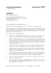 "content": "Landtag Brandenburg Drucksache 3/755 3. Wahlperiode Antwort der Landesregierung auf die Kleine Anfrage Nr. 248 des Abgeordneten Werner Firneburg Fraktion der DVU LT-Drucksache 3/581 Vollstreckung von Todesurteilen II Wortlaut der Kleinen Anfrage Nr. 248 vom 8. Februar 2000: Nach Auskunft der Landesregierung wurden nach Gründung der DDR auf dem Gebiet des heutigen Landes Brandenburg aus dem Bereich des politisch motivierten Strafrechts der DDR gegen elf Personen Todesurteile vollstreckt. Ich frage die Landesregierung: 1. Sind der Landesregierung die Richter und Staatsanwälte be- kannt, die bei diesen Todesurteilen mitgewirkt haben? 2. Wer war Justizminister, als die Todesurteile ausgesprochen bzw. vollstreckt worden sind? Hat der Justizminister auf die damaligen Urteile und Vollstreckungen konkret Einfluss genommen? Wenn ja, welche Erkenntnisse liegen der Landes- regierung darüber vor? 3. Um wie viele Justizbedienstete, die daran beteiligt waren, handelt es sich, und wie viele leben davon heute noch? 4. Wurden gegen die Richter und Staatsanwälte Ermittlungsver- fahren bzw. Anklagen erhoben? Gibt es inzwischen rechts- kräftige Verurteilungen? 5. Gegen welche konkreten Vorschriften nach dem Strafgesetz der damaligen DDR sollen die zum Tode verurteilten Perso- nen, deren Urteil vollstreckt wurde, verstoßen haben? 6. Was war der Grund dafür, dass acht Urteile nicht voll- streckt worden sind? 7. Haben die Familien bzw. Nachkommen der zum Tode verurteil- ten Personen Entschädigungsansprüche gestellt bzw. Ent- schädigungen erhalten? Datum des Eingangs: 10.03.2000 / Ausgegeben: 15.03.2000",
