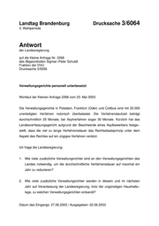 "content": "Landtag Brandenburg Drucksache 3/6064 3. Wahlperiode Antwort der Landesregierung auf die Kleine Anfrage Nr. 2268 des Abgeordneten Sigmar−Peter Schuldt Fraktion der DVU Drucksache 3/5936 Verwaltungsgerichte personell unterbesetzt Wortlaut der Kleinen Anfrage 2268 vom 23. Mai 2003: Die Verwaltungsgerichte in Potsdam, Frankfurt (Oder) und Cottbus sind mit 25.000 unerledigten Verfahren notorisch überbelastet. Die Verfahrenslaufzeit beträgt durchschnittlich 25 Monate, bei Asylverfahren sogar 30 Monate. Kürzlich hat das Landesverfassungsgericht aufgrund der Beschwerde eines Asylbewerbers festge− stellt, dass die viel zu lange Verfahrensdauer das Rechtsstaatsprinzip unter dem Aspekt des Rechtes auf ein zügiges Verfahren verletzt. Ich frage die Landesregierung: 1. Wie viele zusätzliche Verwaltungsrichter sind an den Verwaltungsgerichten des Landes notwendig, um die durchschnittliche Verfahrensdauer auf maximal ein Jahr zu reduzieren? 2. Wie viele zusätzliche Verwaltungsrichter werden in diesem und im nächsten Jahr auf Veranlassung der Landesregierung, trotz der ungünstigen Haushalts− lage, zu welchen Verwaltungsgerichten entsandt? Datum des Eingangs: 27.06.2003 / Ausgegeben: 02.06.2003",