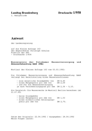 "content": "Landtag Brandenburg Drucksache 1/958 1. Wahlperiode Antwort der Landesregierung auf die Kleine Anfrage 163 des Abgeordneten Christoph Schulze Fraktion der SPD - Drucksache 1/836 Wasserpreis der Potsdamer Wasserversorgung und Abwasserbehandlung GmbH (PWA) Wortlaut der Kleinen Anfrage 163 vom 03.03.1992: Die Potsdamer Wasserversorgung und Abwasserbehandlung GmbH verlangt bei Bereitstellung eines Wasseranschlusses - eine monatliche Grundgebühr von DM 8,40 - einen Mengenpreis pro cbm von DM 2,09 - und für die Abwasserentsorgung je nach Verschmutzungsgrad pro cbm DM 2,36 - 5,10. Als Vergleich: Die Wasserwerke im Westteil Berlins berechnen (ab 01.07.92) - keine Grundgebühr - einen Mengenpreis pro cbm von DM 1,53 - einen einheitlichen Entsorgungs- preis pro cbm von DM 2,70. Datum des Originals: 22.04.1992 / Ausgegeben: 28.04.1992 Meine Fragen lauten:",