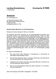 "content": "Landtag Brandenburg Drucksache 4/1845 4. Wahlperiode Antwort der Landesregierung auf die Kleine Anfrage Nr. 699 der Abgeordneten Roswitha Schier Fraktion der CDU Landtagsdrucksache 4/1706 Situation älterer Menschen im Land Brandenburg Wortlaut der Kleinen Anfrage Nr. 699 vom 12.08.2005: Die steigende Zahl älterer Menschen an der Gesamtbevölkerung erfordert neue strukturelle politische und gesellschaftliche Weichenstellungen. Politik für ältere Menschen muss so vielfältig sein wie ihre Bedürfnissee und Interessen. Sie muss die unterschiedliche Lebensgestaltung berücksichtigen und die Selbständigkeit äl− terer Menschen möglichst lange bewahren. Gleichzeitig ist die gesellschaftliche Be− teiligung zu fördern. Ältere Menschen bleiben immer länger körperlich und geistig aktiv. Sie bedürfen nicht primär der Fürsorge oder Bevormundung, sondern erwar− ten zu Recht als wichtige und leistungsfähige Mitglieder der Gesellschaft Akzeptanz. Sie wollen ihre Lebenserfahrung und soziale Kompetenz für die Gesellschaft ein− setzen und weitergeben. Das alles ist aber nur möglich, wenn ältere Menschen auch verlässliche Rahmenbedingungen finden und nicht von Zukunftsängsten geplagt werden. Ich frage die Landesregierung: 1. Wie lange führen ältere Menschen in Brandenburg im Durchschnitt ein überwiegend eigenständiges Leben? 2. Wie viele ältere Menschen leben in betreuten Wohnformen oder Altenheimen und wie viele bedürfen der ambulanten Hilfe? 3. Inwieweit ist eine Tendenz erkennbar, dass ältere Menschen zunehmend von Familienangehörigen betreut werden? 4. Wie wird die gesundheitliche Betreuung älterer Menschen im Land Bran− denburg eingeschätzt? Datum des Eingangs: 06.09.2005 / Ausgegeben: 12.09.2005",