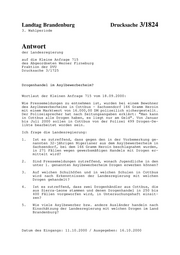 "content": "Landtag Brandenburg Drucksache 3/1824 3. Wahlperiode Antwort der Landesregierung auf die Kleine Anfrage 715 des Abgeordneten Werner Firneburg Fraktion der DVU Drucksache 3/1725 Drogenhandel im Asylbewerberheim? Wortlaut der Kleinen Anfrage 715 vom 18.09.2000: Wie Pressemeldungen zu entnehmen ist, wurden bei einem Bewohner des Asylbewerberheims in Cottbus - Sachsendorf 166 Gramm Heroin mit einem Marktwert von 16.000,00 DM polizeilich sichergestellt. Der Polizeisprecher hat nach Zeitungsangaben erklärt: \"Man kann in Cottbus alle Drogen haben, es liegt nur am Geld\". Von Januar bis Juli 2000 sollen in Cottbus von der Polizei 499 Drogen-De- likte bearbeitet worden sein. Ich frage die Landesregierung: 1. Ist es zutreffend, dass gegen den in der Vorbemerkung ge- nannten 32-jährigen Nigerianer aus dem Asylbewerberheim in Sachsendorf, bei dem 166 Gramm Heroin beschlagnahmt wurden, in 271 Fällen wegen gewerbsmäßigen Handels mit Drogen er- mittelt wird? 2. Sind Pressemeldungen zutreffend, wonach Jugendliche in den unter 1. genannten Asylbewerberheim Drogen erwerben können? 3. Auf welchen Schulhöfen und in welchen Schulen in Cottbus wird nach Erkenntnissen der Landesregierung mit welchen Drogen gehandelt? 4. Ist es zutreffend, dass zwei Drogenhändler aus Cottbus, die aus Sierra-Leone stammen und denen Drogenhandel in 250 bis 400 Fällen vorgeworfen wird, in Untersuchungshaft einsit- zen? 5. Wie viele Asylbewerber bzw. andere Ausländer handeln nach Einschätzung der Landesregierung mit welchen Drogen im Land Brandenburg? Datum des Eingangs: 11.10.2000 / Ausgegeben: 16.10.2000",