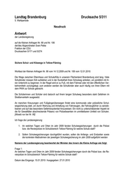 "content": "Landtag Brandenburg Drucksache 5/311 5. Wahlperiode Neudruck Antwort der Landesregierung auf die Kleinen Anfragen Nr. 66 und Nr. 106 der/des Abgeordneten Sven Petke Fraktion der CDU Drucksachen 5/171 und 5/274 Sichere Schul- und Kitawege in Teltow-Fläming Wortlaut der Kleinen Anfragen Nr. 66 vom 14.12.2009 und Nr. 106 vom 12.01.2010: Die Wege zwischen Elternhaus und Schule/Kita in unserem Flächenland Brandenburg sind lang. Viele Schulkinder müssen früh aufstehen und in der Dunkelheit ihren Schulweg antreten, um pünktlich mit ih- ren Unterricht zu beginnen. In der Regel wird er zu Fuß, mit dem Fahrrad oder mit den öffentlichen Ver- kehrsmitteln zurückgelegt, zum anderen werden die Schulkinder aber auch häufig von ihren Eltern mit dem PKW zur Schule gebracht. Die Schülerinnen und Schüler sind dadurch auf ihrem langen Schulweg besonders stark Gefahren im Straßenverkehr ausgesetzt. An manchen Kreuzungen und Fußgängerüberwegen findet eine kommunale oder polizeiliche Schul- wegsicherung statt, um durch Warnung und Anhaltung von Fahrzeugen, die Fahrzeugführer zu sensibi- lisieren und auf das besondere Gefahrenpotential hinzuweisen. Ein nicht zu unterschätzender Aspekt ist die für Gewalttäter abschreckende Präsenz von Polizeibeamten im unmittelbaren Umfeld von Schulen. [Absatz nur bei Nr. 66] Ich frage die Landesregierung: 1. An welchen Tagen und Orten im Jahr 2009 fanden Schulwegsicherungen durch die Polizei bzw. die Revierpolizei im Schutzbereich Teltow-Fläming für welche Schule statt? 2. Sofern Schulwegsicherungen durchgeführt wurden, sollen die Anfangs- und Endzeiten sowie die konkreten Maßnahmen der jeweiligen Schulwegsicherung im Jahr 2009 aufgeführt werden Namens der Landesregierung beantwortet der Minister des Innern die Kleine Anfrage wie folgt: Frage 1: An welchen Tagen und Orten im Jahr 2009 fanden Schulwegsicherungen durch die Polizei bzw. die Re- vierpolizei im Schutzbereich Teltow-Fläming für welche Schule statt? Datum des Eingangs: 15.01.2010 / Ausgegeben: 27.01.2010",