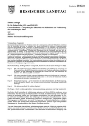 "content": "20. Wahlperiode Drucksache 20/6221 HESSISCHER LANDTAG 08. 09. 2021 Kleine Anfrage Dr. Dr. Rainer Rahn (AfD) vom 02.08.2021 Corona-Pandemie – Überprüfung der Effektivität von Maßnahmen zur Verhinderung der Ausbreitung des Virus und Antwort Minister für Soziales und Integration Vorbemerkung Fragesteller: Im Zusammenhang mit der Corona-Pandemie ordnete die Landesregierung zahlreiche Maßnahmen an mit dem Ziel, die Ausbreitung des Virus zu verhindern bzw. dessen Ausbreitung zu reduzieren. Angeordnet wurde neben der Maskenpflicht und dem Einhalten von Mindestabständen v.a. die Schließung von Einrichtungen, Verbot von Großveranstaltungen, Zugangsbeschränkungen für Gebäude und Einrichtungen, Beschränkung der Teilnehmerzahl bei Veranstaltungen. Grundlage aller Maßnahmen war die Überlegung, dass diese auch tat- sächlich effektiv im Hinblick auf das angestrebte Ziel sind. Während dies bei einigen Maßnahmen mit hoher Wahrscheinlichkeit unterstellt werden kann, erscheint dies bei anderen äußerst fraglich. Dies gilt vor allem für die – häufig auch logisch nicht nachvollziehbare – vollständige Schließung von Einrichtungen. In jedem Fall erscheint es – auch im Hinblick auf die bei zukünftigen Pandemien anzuordnenden Maßnahmen – sinnvoll und erforderlich, die Maßnahmen im Hinblick auf ihre tatsächliche Effektivität hin zu überprüfen. Hierzu ist eine umfangreiche Erhebung von Daten erforderlich, um durch multifaktorielle Analyse die Wirkung jeder einzelnen Maßnahme zu ermitteln. Dies ist aufwendig und schwierig, erscheint aber möglich, da zu un- terschiedlichen Zeitpunkten und an unterschiedlichen Orten die Maßnahmen in zahlreichen verschiedenen Kom- binationen und Ausprägungen angeordnet wurden. Die Vorbemerkung des Fragestellers vorangestellt, beantworte ich die Kleine Anfrage wie folgt: Frage 1. Hält es die Landesregierung für zielführend und erforderlich, eine Erhebung und Auswertung von Datenvorzunehmen, um die Wirksamkeit der einzelnen in der Pandemie angeordneten Maßnahmen im Hinblick auf eine Reduzierung der Ausbreitung des Corona-Virus bzw. eine Reduzierung der Infektions- bzw. Erkrankungsfälle zu ermitteln? Frage 2. Falls erstens zutreffend: Welche konkreten Maßnahmen sollten nach Auffassung der Landesregie- rung besonders auf ihre Effektivität hin überprüft werden – z. B. weil sie die Grundrechte erheblich einschränken oder besonders kostenintensiv sind? Frage 3. Hat die Landesregierung – ggf. in Kooperation mit anderen Bundesländern, der Bundesregierung, der EU oder anderen Staaten – eine wie unter erstens beschriebene Untersuchung veranlasst oder beauftragt? Frage 4. Falls drittens zutreffend: Mit welchem Ergebnis? Die Fragen 1 bis 4 werden aufgrund des Sachzusammenhangs gemeinsam wie folgt beantwortet: Das Robert Koch-Institut hat die Infektionslage spätestens seit Herbst 2020 bis mindestens in den Frühsommer 2021 durchweg als diffus bezeichnet. Das heißt, die Infektionswege lassen sich nicht konkret auf bestimmte Anlässe oder Einrichtungen zurückführen. Dies galt insbesondere für Zei- ten mit hohen Neuinfektionszahlen. Die Erfahrungen der hessischen Gesundheitsämter, anderer Länder und anderer Staaten, beispielsweise Österreich, bestätigen dies. Entsprechend konnten Übertragungen von Infektionen nur durch Verringerung von Kontaktmöglichkeiten verhindert werden. Nahezu alle Staaten haben entsprechend vergleichbare, teilweise sogar weitergehendere Maßnahmen der Kontaktreduktion über längere Zeiträume getroffen. Vor dem Hintergrund eines diffusen Infektionsgeschehens kann die Effektivität einzelner Maß- nahmen auch nicht trennscharf beurteilt werden. Hierfür ist bereits auch die Teilnahme am sozi- alen, gesellschaftlichen und wirtschaftlichen Leben individuell zu unterschiedlich ausgeprägt. Die Eingegangen am 9. September 2021 · Ausgegeben am 10. September 2021 Herstellung: Kanzlei des Hessischen Landtags · Postfach 3240 · 65022 Wiesbaden · www.Hessischer-Landtag.de",
