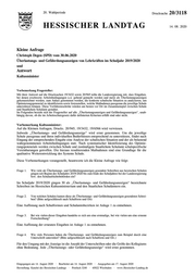 "content": "20. Wahlperiode Drucksache 20/3118 HESSISCHER LANDTAG 14. 08. 2020 Kleine Anfrage Christoph Degen (SPD) vom 30.06.2020 Überlastungs- und Gefährdungsanzeigen von Lehrkräften im Schuljahr 2019/2020 und Antwort Kultusminister Vorbemerkung Fragesteller: Mit ihrer Antwort auf die Drucksachen 19/3432 sowie 20/945 teilte die Landesregierung mit, dass Eingaben, bei denen erschwerte Arbeitsbedingungen u.ä. geltend gemacht werden und meist als Überlastungsanzeigen gekennzeichnet werden, zum Anlass genommen werden, die konkrete schulische Situation zu analysieren, um Optimierungspotenzial zu identifizieren sowie festzustellen, welche Maßnahmen passgenau die jeweilige Schule unterstützen können. Diese Verfahrensschritte würden am besten vor Ort im Zusammenspiel zwischen Schule und Staatlichem Schulamt gestaltet. Im Folgenden bezieht sich der Fragesteller auf alle „Überlastungsanzeigen und Gefährdungsanzeigen“, unab- hängig davon, ob die im Arbeitsschutzgesetz dafür definierten Kriterien erfüllt sind oder nicht. Vorbemerkung Kultusminister: Auf die Kleinen Anfragen, Drucks. 20/945, 19/3432, 19/6566 wird verwiesen. Jedwede „Überlastungs- und Gefährdungsanzeige“ wird ernst genommen. Um die jeweilige Schule passgenau und ihren individuellen Bedürfnissen entsprechend zu unterstützen, findet nach Eingang der entsprechenden Eingabe eine Analyse der schulischen Situation und der als belastend wahrgenommenen Arbeitsbedingungen statt. Nach systematischer Identifizierung des Optimie- rungspotenzials werden zwischen Schule und zuständigem Staatlichem Schulamt schulspezifische Vereinbarungen getroffen. Die hieraus resultierenden Maßnahmen sind eine Grundlage für die qualitative Weiterentwicklung des Systems Schule. Diese Vorbemerkungen vorangestellt, beantworte ich die Kleine Anfrage wie folgt: Frage 1. Wie viele als Überlastungs- und Gefährdungsanzeigen gesendete Schreiben aus hessischen Schulen gingen seit Beginn des Schuljahrs 2019/2020 bis zum Ende des Schuljahres bei der Landesregierung bzw. den Schulaufsichtsbehörden ein? Im Schuljahr 2019/2020 gingen 30 als „Überlastungs- und Gefährdungsanzeigen“ bezeichnete Schreiben im Hessischen Kultusministerium und den Staatlichen Schulämtern ein. Frage 2. Von welchen Schulen kamen diese als Überlastungs- und Gefährdungsanzeigen gesendeten Schrei- ben? (Bitte aufgeschlüsselt nach Schulform und Ort) Eine Auflistung nach Schulformen und Schulamtsbezirken ist Anlage 1 zu entnehmen. Frage 3. Bei wie vielen dieser Eingaben handelte es sich um eine erstmalige, bei wie vielen um eine erneute Fortschreibung? Eine Auflistung der erneuten Eingaben ist Anlage 1 zu entnehmen. Frage 4. Wie viele Personen haben die Überlastungs- und Gefährdungsanzeigen zum Beispiel durch eine Unterschrift unterstützt? (Bitte aufgeschlüsselt nach Schulform und Ort.) Für den Umgang mit der Anzeige ist die Anzahl der Unterschriften oder die Größe des Kollegiums ohne Bedeutung. Jede „Überlastungs- oder Gefährdungsanzeige“ wird ernst genommen. Eingegangen am 14. August 2020 · Bearbeitet am 14. August 2020 · Ausgegeben am 17. August 2020 Herstellung: Kanzlei des Hessischen Landtags · Postfach 3240 · 65022 Wiesbaden · www.Hessischer-Landtag.de",