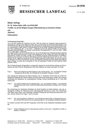 "content": "20. Wahlperiode Drucksache 20/2938 HESSISCHER LANDTAG 13. 10. 2020 Kleine Anfrage Dr. Dr. Rainer Rahn (AfD) vom 05.06.2020 Vorfälle von auf die Religion bezogene Diskriminierung an hessischen Schulen und Antwort Kultusminister Vorbemerkung Fragesteller: Am 12.09.2018 richteten die Fraktionen der CDU, SPD und Grünen der Frankfurter Stadtverordnetenver- sammlung eine Anfrage an den Magistrat (A389), die sich auf den Erlass des Hessischen Kultusministers vom 23.05.2018 bezieht. Mit diesem Erlass hatte das Ministerium die Schulleitungen der hessischen Schulen gebe- ten, antisemitische Vorfälle gemäß § 23 Dienstordnung der für die Schule zuständigen Dienstaufsicht zu mel- den. Diese Aufforderung gilt – so der Erlass – sinngemäß auch für alle anderen Vorfälle von auf Religion bezogenen Diskriminierungen. Die Anfrage wurde mit dem Zwischenbericht B 73 vom 21.02.2020 – mithin fast 1 ½ Jahre später – beantwortet. Der Magistrat führt in diesem Zwischenbericht aus, dass er die Fallzahlen beim Staatlichen Schulamt angefragt habe. Eine Antwort liege noch nicht vor und werde nachgereicht. In der Anfrage wird explizit nur gefragt, ob antisemitische Vorfälle und andere Vorfälle von auf Religion bezogenen Diskriminierungen an Frankfurter Schulen aus dem Zeitraum von 2016 bis 2018 bekannt sind. Die Anfrage hätte insoweit mit „ja“ bzw. „nein“ und ggf. mit der Angabe der Anzahl und Art der Vorfälle beantwortet werden können. Da sich die Frage auf den Zeitraum von 2016 bis 2018 bezieht, müssten dem Staatlichen Schulamt die entsprechenden Informationen längst vorliegen, da kaum davon auszugehen ist, dass die angefragten Vorfälle erst nach mehreren Jahren gemeldet werden. Die Vorbemerkung des Fragestellers vorangestellt, beantworte ich die Kleine Anfrage im Einver- nehmen mit dem Chef der Staatskanzlei sowie dem Minister des Innern und Sport wie folgt: Frage 1. Wann ist der Magistrat der Stadt Frankfurt an die Landesregierung – bzw. das Staatliche Schulamt – herangetreten mit der Bitte, die Fallzahlen für die genannten Vorgänge zu nennen? Eine Anfrage des Magistrats der Stadt Frankfurt vom 12. September 2018 konnte im Archiv des Staatlichen Schulamts der Stadt Frankfurt am Main nicht mehr rekonstruiert werden. Die weiteren Nachfragen des Magistrats zur ursprünglichen Anfrage wurden abschließend am 25. Juni 2020 beantwortet. Frage 2. Aus welchen Gründen hat die Landesregierung – bzw. das Staatliche Schulamt – die gewünschte Auskunft (noch) nicht erteilt, obwohl die entsprechenden Informationen seit längerer Zeit vorliegen müssten? Die Amtsleitung des Staatlichen Schulamts der Stadt Frankfurt am Main bedauert, dass die ur- sprüngliche Anfrage des Magistrats nicht ordnungsgemäß beantwortet wurde. Die Amtsleitung wird dafür Sorge tragen, dass zukünftige Anfragen fristgerecht und umfassend beantwortet wer- den. Auf die Antwort zur Frage 1 wird verwiesen. Frage 3. Wie viele antisemitische Vorfälle bzw. auf die Religion bezogene Fälle von Diskriminierung wur- den zwischen 2016 und 2019 an die Landesregierung bzw. die zuständigen Schulämter gemeldet? Es wurden zwischen 2016 und 2019 insgesamt zwölf Fälle an die Staatlichen Schulämter gemel- det. Frage 4. Welche Maßnahmen hat die Landesregierung ergriffen, um die unter 3. aufgeführten Vorfälle zu- künftig zu verhindern? Eingegangen am 13. Oktober 2020 · Bearbeitet am 13. Oktober 2020 · Ausgegeben am 15. Oktober 2020 Herstellung: Kanzlei des Hessischen Landtags · Postfach 3240 · 65022 Wiesbaden · www.Hessischer-Landtag.de",