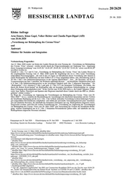 "content": "20. Wahlperiode Drucksache 20/2628 HESSISCHER LANDTAG 29. 06. 2020 Kleine Anfrage Arno Enners, Klaus Gagel, Volker Richter und Claudia Papst-Dippel (AfD) vom 20.04.2020 „Verordnung zur Bekämpfung des Corona-Virus“ und Antwort Minister für Soziales und Integration Vorbemerkung Fragesteller: Am 13. März 2020 wurde von Seiten des Landes Hessen die erste Fassung der „Verordnung zur Bekämpfung 1 des Corona -Virus\" erlassen , welche jeweils durch die Folgeverordnungen zur Änderung- bzw. Anpassung 2 3 4 5 6 7 8 dieser Ausgangsverordnung vom 14.03.20, 16.03.20 , 20.03.20, 22.03.20, 23.03.20, sowie vom 08.04.20 novelliert worden ist. Gemäß § 1 Abs.1 S.1 und S.2 der „Verordnung zur Bekämpfung des Corona -Virus\" des Landes Hessen in der ursprünglichen Fassung vom 13. März 2020 wurde für Angehörige der in § 1 Abs.2 jener Verordnung aufgezählten Personengruppen, „die sich in den 14 Tagen vor Inkrafttreten dieser Verordnung oder danach in einem Risikogebiet für Infektionen mit dem SARS-CoV-2-Virus aufgehalten haben, eine Absonderung nach § 30 Abs.1 Satz 2 des Infektionsschutzgesetzes in der eigenen Häuslichkeit\"-, bzw. „für Personen, auf die die Voraussetzungen aus Satz 1 zutreffen, mit Wohnsitz außerhalb Hessens ... ein berufliches Tätigkeitsverbot nach § 31 Satz 1 des Infektionsschutzgesetzes in der jeweiligen Tätigkeit nach Abs. 2 allgemein angeordnet.\" Als „Risikogebiet\" i.S.d. zitierten § 1 Abs.1 galt gem. § 1 Abs.3 S.1 der benannten Verordnung „ein Gebiet, das 9 durch das Robert Koch-Institut als Risikogebiet oder als besonders betroffenes Gebietfestgelegt ist, solange diese Festlegung nicht aufgehoben wird.\" In der Zeit bis zum 10.04.2020 sind u.a. die Länder Ägypten, Frank- reich, Iran, Italien, Österreich und Spanien oder Regionen innerhalb dieser Länder durch das RKI zu „Risiko- 10 gebieten\" erklärt worden. Im Wege der „Verordnung zur Anpassung der Verordnungen zur Bekämpfung des Corona -Virus vom 20. 11 März 2020\" ist u.a. zunächst die Beschränkung der Anordnungen der häuslichen Quarantäne und des Verbots der beruflichen Betätigung auf die in § 1 Abs. 2 der in Rede stehenden Verordnung in ihren bisherigen Fassun- gen aufgezählten Personenkreise aufgehoben- und mithin der personelle Anwendungsbereich jener Anordnun- gen auf sämtliche Personen, die innerhalb des benannten Zeitraumes aus sog. Risikogebieten eingereist waren, ausgeweitet worden; auch lässt die weitere Formulierung der „Verordnung zur Anpassung der Verordnungen zur Bekämpfung des Corona -Virus vom 20. März 2020\" eine Ausweitung des Verbots der beruflichen Betäti- gung, welches ursprünglich nur in § 1 Abs. 2 benannten Personenkreise gelten sollte, auf sämtliche aus sog. Risikogebieten eingereiste Personen erkennen. Eingegangen am 29. Juni 2020 · Eilausfertigung am 29. Juni 2020 · Ausgegeben am 2. Juli 2020 Herstellung: Kanzlei des Hessischen Landtags · Postfach 3240 · 65022 Wiesbaden · www.Hessischer-Landtag.de 1 In der Fassung vom 13. März 2020, abrufbar über: https://www.hessen.de/sites/default/files/media/staatskanzlei/absonderung funktionsperonal.pdf. 2 Eine Gesamtauflistung jener Verordnungen ist abrufbar unter: https://www.hessen.de/fuer-buerger/corona- hessen/ verordnungen-und-allgemeinverfuegungen. 3 abrufbar über: https://www.hessen.de/sites/default/files/media/staatskanzlei/aenderungsverodnung_zur_bekaemp- fung_von_corona.pdf. 4 abrufbar über: https://www.hessen.de/sites/default/files/media/staatskanzlei/2020-03-16_2te_a- endvo_zur_1sten_vo_corona_funktionspersona_l datum_1.pdf. 5 abrufbar über: https://www.hessen.de/sites/default/files/media/anpassungsverordnung_20.3.pdf. 6 abrufbar über: https://www.hessen.de/sites/default/files/media/staatskanzlei/verordnun_ zur_beschraenkung_sozialer_kon- takteend_ 22032020_2115_uhr.pdf. 7 abrufbar über: https://www.hessen.de/sites/default/files/media/zweite_verordnung_ zur_anpassung_der_ verordnungen_ zur_bekaempfung_des_corona-virus.pdf. 8 abrufbar über: https://www.hessen.de/sites/default/files/media/staatskanzlei/gvb1._ nr_17.pdf. 9 Nachfolgend RKI abgekürzt. 10 Vgl. die „täglichen Lageberichte\" des RIG zur Coronavirus-Krankheit-2019 aus der Zeit bis zum 10.04.20 im „Archiv der Situationsberichte des Robert Koch -Instituts zu COVID-19 (ab 4.3.2020)\", abrufbar über: https://wwvv.rki.de/DE/Content/InfAZ/N/Neuartiges Coronavirus/Situationsberichte/Archiv.html. 11 abrufbar über: https://www.hessen.de/sites/default/files/media/anpassungsverordnung_20.3.pdf.",
