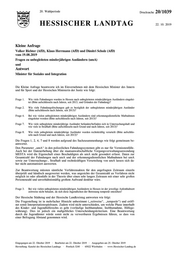 "content": "20. Wahlperiode Drucksache 20/1039 HESSISCHER LANDTAG 22. 10. 2019 Kleine Anfrage Volker Richter (AfD), Klaus Herrmann (AfD) und Dimitri Schulz (AfD) vom 19.08.2019 Fragen zu unbegleiteten minderjährigen Ausländern (umA) und Antwort Minister für Soziales und Integration Die Kleine Anfrage beantworte ich im Einvernehmen mit dem Hessischen Minister des Innern und für Sport und der Hessischen Ministerin der Justiz wie folgt: Frage 1. Wie viele Fahndungen wurden in Hessen nach unbegleiteten minderjährigen Ausländern eingelei- tet (Bitte aufschlüsseln nach Jahren, seit 2013, und Gründen der Fahndung)? Frage 2. Wie viele Fahndungslöschungen gab es bezüglich der unbegleiteten minderjährigen Ausländer (Bitte aufschlüsseln nach Jahren, seit 2013)? Frage 4. Bei wie vielen unbegleiteten minderjährigen Ausländern sind erkennungsdienstliche Maßnahmen eingeleitet worden (Bitte aufschlüsseln nach Jahren, seit 2013)? Frage 7. Wie viele unbegleitete minderjährige Ausländer befanden/befinden sich in Untersuchungshaft und wie viele in Strafhaft (Bitte aufschlüsseln nach Grund und nach Jahren, seit 2013)? Frage 8. Wie viele unbegleitete minderjährige Ausländer wurden rechtskräftig verurteilt (Bitte aufschlüs- seln nach Grund und nach Jahren, seit 2013)? Die Fragen 1, 2, 4, 7 und 8 werden aufgrund des Sachzusammenhangs wie folgt gemeinsam be- antwortet. Den Parameter „umA“ in den polizeilichen Fahndungssystemen gibt es nur für Vermisstenfälle. Auch bei der Datenerhebung über die staatsanwaltschaftliche Vorgangsverwaltungsanwendung MESTA wird die Eigenschaft eines Beschuldigten als umA nicht gesondert erfasst. Daten zur Gesamtzahl der Fahndungen nach umA und der erkennungsdienstlichen Maßnahmen bei umA sowie zur Untersuchungs-, Strafhaft und rechtskräftigen Verurteilung von umA lassen sich da- her nicht automatisiert auswerten. Zur Beantwortung müssten sämtliche Verfahrensakten für den angefragten Zeitraum einzeln überprüft und händisch ausgewertet werden, was angesichts der Gesamtzahl an Verfahren nicht möglich ist oder allenfalls in der Theorie über einen sehr langen Zeitraum mit einer sehr großen Personenzahl und unverhältnismäßig großem Aufwand denkbar wäre. Frage 3. Bei wie vielen unbegleiteten minderjährigen Ausländern in Hessen ist der jeweilige Aufenthaltsort zeitweise nicht bekannt, da sich diese Jugendlichen der Betreuung temporär entziehen? Der Hessische Städtetag und der Hessische Landkreistag antworten wie folgt: Die Fragestellung ist in mehrfacher Hinsicht unbestimmt („zeitweise“, „temporär“) und eröff- net somit Interpretationsspielraum. Zudem wird nicht unterschieden, um welche Phase innerhalb des Kinder- und Jugendhilferechts es geht (vorläufige Inobhutnahme, Inobhutnahme, Hilfege- währung). Dies ist jedoch ein maßgebliches Unterscheidungskriterium. Eine Beantwortung durch die Jugendämter würde somit nicht zu verwertbaren Ergebnissen führen, so dass von einer Befragung Abstand genommen wird. Eingegangen am 22. Oktober 2019 · Bearbeitet am 22. Oktober 2019 · Ausgegeben am 25. Oktober 2019 Herstellung: Kanzlei des Hessischen Landtags · Postfach 3240 · 65022 Wiesbaden · www.Hessischer-Landtag.de",
