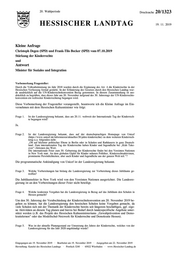 "content": "20. Wahlperiode Drucksache 20/1323 HESSISCHER LANDTAG 19. 11. 2019 Kleine Anfrage Christoph Degen (SPD) und Frank-Tilo Becker (SPD) vom 07.10.2019 Stärkung der Kinderrechte und Antwort Minister für Soziales und Integration Vorbemerkung Fragesteller: Durch die Volksabstimmung im Jahr 2018 wurden durch die Ergänzung des Art. 4 die Kinderrechte in der Hessischen Verfassung formal gestärkt. In der Erläuterung des Gesetzes durch den Hessischen Landtag wur- de ausdrücklich auf die UN-Kinderrechtskonvention Bezug genommen. In diesem Zusammenhang ist aus- drücklich zu begrüßen, dass dieses Jahr am 20. November aufgrund des 30. Jahrestags der UN-Kinderrechts- konvention ein weltweiter Kinderrechtetag begangen wird. Diese Vorbemerkung der Fragesteller vorangestellt, beantworte ich die Kleine Anfrage im Ein- vernehmen mit dem Hessischen Kultusminister wie folgt: Frage 1. Ist der Landesregierung bekannt, dass am 20.11. weltweit der Internationale Tag der Kinderrech- te begangen wird? Ja. Frage 2. Ist der Landesregierung bekannt, dass auf der deutschsprachigen Homepage von Unicef (https://www.unicef.de/informieren/aktuelles/30-jahre-kinderrechte) zu dem weiteren Kinderrech- tetag u.a. folgenden steht: „Ob auf höchster politischer Ebene in Berlin oder in Schulen und Rathäusern in ganz Deutsch- land: Zum internationalen Tag der Kinderrechte haben Kinder und Jugendliche bei „Kids Take- over“-Aktionen das Wort. Die internationale Feier zum 30. Geburtstag der Kinderrechte findet bei den Vereinten Nationen in New York statt. An dem globalen Gipfel für Kinder nehmen Politiker, Kinderrechtsaktivisten, prominente Persönlichkeiten, aber auch Kinder und Jugendliche aus der ganzen Welt teil.“? Die programmatische Ankündigung von Unicef ist der Landesregierung bekannt. Frage 3. Welche Vorbereitungen hat bislang die Landesregierung zur Vorbereitung dieses Jubiläums ge- troffen? Die Jubiläumsfeier in New York wird von den Vereinten Nationen ausgerichtet. Die Landesre- gierung ist an den Vorbereitungen dieser Feier nicht beteiligt. Frage 4. Welche konkreten Vorgaben hat die Landesregierung in Bezug auf das Jubiläum den Schulen in Hessen gemacht? Um den 30. Jahrestag der Verabschiedung der Kinderrechtekonvention am 20. November 2019 be- gehen zu können, hat die Landesregierung den hessischen Schulen keine Vorgaben gemacht, da viele Schulen sich mit der Thematik der Kinderrechte bereits seit längerem beschäftigen, ggf. eige- ne Aktivitäten an diesem Tag planen und hierzu bei Bedarf durch landesspezifische Angebote unter- stützt werden (z.B. das Projekt des Hessischen Kultusministeriums „Gewaltprävention und Demo- kratielernen“ oder das Modellschul-Netzwerk für Kinderrechte und Demokratie Hessen). Frage 5. Was ist der aktuelle Planungsstand zur Umsetzung des Jahres der Kinderrechte, welches von der Landesregierung für das Jahr 2020 angekündigt wurde? Eingegangen am 19. November 2019 · Bearbeitet am 19. November 2019 · Ausgegeben am 22. November 2019 Herstellung: Kanzlei des Hessischen Landtags · Postfach 3240 · 65022 Wiesbaden · www.Hessischer-Landtag.de",