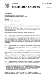 "content": "20. Wahlperiode Drucksache 20/1034 HESSISCHER LANDTAG 22. 10. 2019 Kleine Anfrage Christiane Böhm (DIE LINKE) vom 15.08.2019 Menschen ohne Krankenversicherungsschutz in Hessen und Antwort Minister für Soziales und Integration Vorbemerkung Minister für Soziales und Integration: Die Hessische Landesregierung hat sich im Koalitionsvertrag Anfang dieses Jahres darauf ver- ständigt, für Menschen ohne Versicherungsschutz zu prüfen, inwieweit eine anonyme Kranken- behandlung bezahlt erfolgen kann: „Wir werden prüfen, in welcher Form ein Fonds eingeführt werden kann, der eine anonyme Krankenbehandlung ermöglicht. Dabei können Modelle des anonymen Krankenscheins aus an- deren Ländern Vorbild sein.“ Diese Vorbemerkung vorangestellt, beantworte ich die Kleine Anfrage wie folgt: Frage 1. Wie viele Menschen in Hessen verfügen über keinen Krankenversicherungsschutz? (Bitte soweit möglich nach Geschlecht, Alter und Nationalität aufschlüsseln) Zahlen dazu, wie viele Menschen in Deutschland ohne Versicherungsschutz leben, hat das Sta- tistische Bundesamt erfasst und in seiner Pressemitteilung Nr. 40 vom 4. Oktober 2016 berich- tet, dass im Jahr 2015 in Deutschland rund 80.000 Menschen ohne Krankenversicherungsschutz waren. Das entspricht 0,1 % der Bevölkerung (Ergebnisse des alle vier Jahre erhobenen Zu- satzprogramms „Angaben zur Krankenversicherung“ aus dem Mikrozensus). Zahlen für Hessen liegen nicht vor. Frage 2. Welche Hauptursachen sieht die Landesregierung für einen fehlenden Krankenversicherungs- schutz? Frage 3. Welche Auswirkungen hat dies auf die medizinische Versorgung, z.B. Kostenübernahme für Not- fallbehandlungen? Frage 4. Welche Kenntnisse hat die Landesregierung zum Zusammenhang zwischen Morbidität, Mortalität und dem Nichtvorhandensein einer Krankenversicherung? Die Fragen 2, 3 und 4 werden aufgrund des Sachzusammenhangs wie folgt gemeinsam beant- wortet. Bezüglich der konkreten Ausgestaltung des Vorhabens werden wir in dieser Legislaturperiode die Möglichkeiten prüfen, siehe dazu auch die Vorbemerkung. Im Zuge dessen werden auch die Punkte der Fragen 2 bis 4 betrachtet werden. Dabei ist es uns ein wichtiges Anliegen, ein Mo- dell zu gestalten, das dauerhaft trägt. Hierzu werden wir uns im Rahmen der Prüfung auch die Erfahrungen in anderen Ländern mit der Ausgabe eines anonymen Krankenscheins anschauen. Frage 5. Welche Möglichkeiten der gesundheitlichen Versorgung von Menschen ohne Krankenversiche- rungsschutz gibt es in Hessen? (Bitte nach Orten, Angebot, Trägern und Umfang aufgliedern) Frankfurt: Vom Gesundheitsamt Frankfurt am Main werden verschiedene Sprechstunden angeboten: Humanitäre Erwachsenensprechstunde 2x/Woche: Allgemeinmedizinische Sprechstunde mit Basisdiagnostik und -versorgung von z. B: Herz - Kreislauf Erkrankungen, Diabetes melli- tus, Bluthochdruck, Infektionskrankheiten, Atemwegserkrankungen, Verletzungen etc. Diagnostik: Untersuchung, Labor, Ultraschall, EKG Eingegangen am 22. Oktober 2019 · Bearbeitet am 22. Oktober 2019 · Ausgegeben am 25. Oktober 2019 Herstellung: Kanzlei des Hessischen Landtags · Postfach 3240 · 65022 Wiesbaden · www.Hessischer-Landtag.de",