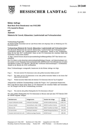 "content": "20. Wahlperiode Drucksache 20/2440 HESSISCHER LANDTAG 23. 03. 2020 Kleine Anfrage René Rock (Freie Demokraten) vom 19.02.2020 CO2-Ausstoß in Hessen und Antwort Ministerin für Umwelt, Klimaschutz, Landwirtschaft und Verbraucherschutz Vorbemerkung Fragesteller: Die Bundesrepublik Deutschland und das Land Hessen haben sich ehrgeizige Ziele zur Minderung der CO2- Emissionen gesetzt. Vorbemerkung Ministerin für Umwelt, Klimaschutz, Landwirtschaft und Verbraucherschutz: Das Hessische Ministerium für Umwelt, Klimaschutz, Landwirtschaft und Verbraucherschutz veröffentlicht jährlich eine Treibhausgasbilanz auf Landesebene. Aktuell ist die Treibhausgas- bilanz für das Jahr 2017 veröffentlicht. Daten zu den CO 2-Emissionen der einzelnen Städte und Gemeinden werden nicht erhoben: https://umwelt.hessen.de/presse/pressemitteilung/treibhausgasbilanz-2017-fuer-hessen-vero- effentlicht Die CO2-Daten zu den deutschen emissionshandelspflichtigen Energie- und Industrieanlagen wer- den zentral von der Deutschen Emissionshandelsstelle (DEHSt) beim Umweltbundesamt verwaltet und jährlich in einem VET-Bericht („Bericht über verifizierte Emissionsmengen“) veröffentlicht. Aktuell ist der Bericht für 2018 veröffentlicht. Diese Vorbemerkungen vorangestellt, beantworte ich die Kleine Anfrage wie folgt: Frage 1. Wie hoch sind die CO2-Emissionen in den zehn größten hessischen Städten jeweils? Frage 2. Wie haben sich die CO2-Emissionen in den zehn größten hessischen Städten in den letzten fünf Jahren jeweils entwickelt? Frage 3. Welche hessischen Städte haben die höchsten CO2-Emissionen (bitte die Top-10 angeben)? Aufgrund des sachlichen Zusammenhangs werden die Fragen 1 bis 3 gemeinsam beantwortet. Dem Land Hessen liegen keine Daten zu CO 2-Emissionen der einzelnen Städte und Gemeinden vor. Im Übrigen wird auf die Vorbemerkung verwiesen. Frage 4. Was sind die zehn größten Punktquellen für CO2-Emissionen in Hessen? Die zehn größten Punktquellen für CO2-Emissionen in Hessen sind nach dem VET-Bericht 2018 der DEHSt folgende Anlagen: Tonnen Betreibername Anlagenname Standort der Anlage CO2-Äq Uniper Kraftwerke GmbH Kraftwerk Staudinger 63538 Großkrotzenburg 1.583.274 Infraserv GmbH Heizkraftwerk, Geb. D 580 65929 Frankfurt-Höchst 1.010.150 Mainova AG Heizkraftwerk West 60327 Frankfurt am Main 709.806 K+S Kali GmbH Kraftwerk Hattdorf 36269 Philippsthal/Werra 291.379 Schaefer Kalk GmbH & Co KG Kalkbrennanlage Steeden 65594 Runkel 289.205 Eingegangen am 23. März 2020 · Bearbeitet am 23. März 2020 · Ausgegeben am 25. März 2020 Herstellung: Kanzlei des Hessischen Landtags · Postfach 3240 · 65022 Wiesbaden · www.Hessischer-Landtag.de",