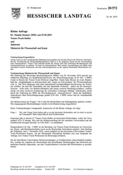 "content": "20. Wahlperiode Drucksache 20/572 HESSISCHER LANDTAG 18. 06. 2019 Kleine Anfrage Dr. Daniela Sommer (SPD) vom 07.05.2019 Tenure-Track-Stellen und Antwort Ministerin für Wissenschaft und Kunst Vorbemerkung Fragestellerin: Tenure Track ist dem amerikanischen Bildungssystem entlehnt und soll den Weg in die Professur erleichtern. Seit der Novellierung des Hochschulrahmengesetzes 2002 ist es ein möglicher Zusatz bei der Ausschreibung einer Juniorprofessur. Tenure Track bedeutet hierbei die Zusage nach einer befristeten Bewährungszeit eine Lebenszeitprofessur zu erhalten. So kann ein Juniorprofessor ohne erneute Ausschreibung und mithin unter Ausschluss externer Konkurrenz auf eine Lebenszeitprofessur an der eigenen Hochschule übernommen wer- den. Vorbemerkung Ministerin für Wissenschaft und Kunst: Mit Änderung des Hessischen Hochschulgesetzes (HHG) vom 30. November 2015 und der neu etablierten Regelung zur Qualifikationsprofessur mit Entwicklungszusage (§ 64 Abs. 3 HHG) wurde in Hessen die Tenure-Track-Professur eingeführt. Damit hatte Hessen als erstes Bundes- land die ,,Empfehlungen zu Karrierezielen und -wegen an Universitäten\" des Wissenschaftsrats vom 11. Juli 2014 umgesetzt und einen international anschlussfähigen Karriereweg zur Profes- sur eröffnet, bei dem die Übernahme auf eine dauerhafte Professur - anders als bei Juniorpro- fessuren - nicht mehr von Stellenvorbehalten und einem weiteren Berufungsverfahren, sondern einzig von einer positiven Evaluierung der erbrachten Leistungen abhängt. Gleichzeitig wurde durch die Änderung des HHG die Personalkategorie „Juniorprofessur“ durch die Qualifikati- onsprofessur ohne Entwicklungszusage gemäß § 64 Abs. 5 HHG ersetzt und als Ausnahmefall vorgesehen. Zur Beantwortung der Fragen 1 bis 6 sind die Hochschulen um Stellungnahme gebeten worden. Die eingegangenen Rückmeldungen wurden in die Beantwortung eingearbeitet. Diese Vorbemerkungen vorangestellt, beantworte ich die Kleine Anfrage wie folgt: Frage 1. Wie viele Tenure-Track-Stellen gibt es an den hessischen Hochschulen und wie hoch ist jeweils der Frauenanteil? (Bitte aufgeschlüsselt nach Fachbereichen) Insgesamt gibt es derzeit 47 Tenure-Track-Stellen an hessischen Hochschulen, wobei der Frau- enanteil 42,6 % beträgt. Wie sich die Stellenverteilung für die einzelnen Universitäten und auf Fachbereiche bezogen darstellt, ist ANLAGE 1 zu entnehmen. Entsprechend § 64 Abs. 3 HHG ist die Berufung von Tenure-Track-Professuren an Universitä- ten, Kunst- und Musikhochschulen sowie an der Hochschule Geisenheim möglich. Zum Stichtag der Erhebung, dem 1. Dezember 2018, waren lediglich an den hessischen Universitäten Tenure- Track-Professuren besetzt. An der Hochschule Geisenheim befinden sich zum Zeitpunkt der Anfrage zwei Tenure-Track-Professuren im Besetzungsverfahren. Da die betroffenen Universitäten Fächerzuordnungen zu Fachbereichen unterschiedlich handha- ben, wurden die Angaben der Hochschulen den betreffenden Fächergruppen laut Definition der amtlichen Statistik zugeordnet, um eine Vergleichbarkeit zwischen den Hochschulen zu gewähr- leisten. Eingegangen am 18. Juni 2019 · Ausgegeben am 24. Juni 2019 Herstellung: Kanzlei des Hessischen Landtags · Postfach 3240 · 65022 Wiesbaden · www.Hessischer-Landtag.de",