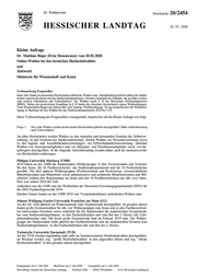 "content": "20. Wahlperiode Drucksache 20/2454 HESSISCHER LANDTAG 02. 07. 2020 Kleine Anfrage Dr. Matthias Büger (Freie Demokraten) vom 20.02.2020 Online-Wahlen bei den hessischen Hochschulwahlen und Antwort Ministerin für Wissenschaft und Kunst Vorbemerkung Fragesteller: Jedes Jahr finden an hessischen Hochschulen zahlreiche Wahlen statt. Fakultätsübergreifend wählen die Studie- renden zumeist den Senat und das Studierendenparlament. Gremien innerhalb der Fakultät, die gewählt werden, sind zumeist Fakultätsrat und Fachschaftsrat. Die Wahlen regelt § 35 des Hessischen Hochschulgesetzes (HHG). Neben der gesetzlichen Grundlage in § 35 haben die einzelnen Hochschulen eigene Wahlordnungen. Viele Hochschulen klagen seit Jahren über eine niedrige Wahlbeteiligung. So lag beispielsweise die Wahlbetei- ligung in Marburg bei den Wahlen für das Studierendenparlament 2018 bei 12%. Diese Vorbemerkung des Fragestellers vorangestellt, beantworte ich die Kleine Anfrage wie folgt: Frage 1. Wie viele Wahlen werden an hessischen Hochschulen jährlich durchgeführt? (Bitte Aufschlüsselung nach Universitäten) An allen Hochschulen werden Wahlen zu den zentralen und dezentralen Gremien der Selbstver- waltung, zu den Gremien der Studierendenschaft, direkte Wahlen zur Personalvertretung sowie zu den Jugend- und Auszubildendenvertretungen, zur Schwerbehindertenvertretung, indirekte Wahlen von Ausschussmitgliedern und von Dekanats- und Präsidiumsmitglieder sowie von Be- auftragten durchgeführt. In die folgende Aufschlüsselung wurden daher auch die nichtuniversitä- ren Hochschulen einbezogen. Philipps-Universität Marburg (UMR) 2019 haben an der UMR die Studierenden (Wählergruppe 3) ihre Vertreterinnen und Vertreter für den Senat, die 16 Fachbereichsräte, das Studierendenparlament und die 16 Fachschaftsräte gewählt. Die drei anderen Wählergruppen (Professorinnen und Professoren, wissenschaftliche Mitarbeiterinnen und Mitarbeiter sowie administrative und technische Mitarbeiterinnen und Mit- arbeiter) wählen ihre Repräsentanz im Senat und den 16 Fachbereichsräten nur alle zwei Jahre. Dies war zuletzt 2018 der Fall. Außerdem war die UMR eine der Wahlstellen der Deutschen Forschungsgemeinschaft (DFG) für die DFG-Fachkollegienwahl 2019. Darüber hinaus fanden an der UMR 2019 vier Vizepräsidentinnen/-präsidenten-Wahlen statt. Johann Wolfgang Goethe-Universität Frankfurt am Main (GU) An der GU wird jährlich im Wintersemester eine Gremienwahl durchgeführt. In geraden Jahren finden große Gremienwahlen für alle vier Wählergruppen zum Senat und zu den Fachbereichsrä- ten (universitäre Gremien) sowie zusätzlich für die Studierenden die studentischen Gremienwah- len zum Studierendenparlament, zu den Fachschaftsräten und zum Rat des L-Netzes (für Lehr- amtsstudierende) statt. Die letzte große Gremienwahl fand im Februar 2019 statt. Die Wähler- gruppe der Studierenden wählt jährlich die Fachbereichsräte und die studentischen Gremien zum Studierendenparlament, zu den Fachschaftsräten und zum Rat des L-Netzes. Technische Universität Darmstadt (TUD) An der TUD werden regelmäßig jedes Jahr im Sommersemester Hochschulwahlen durchgeführt; im Wechsel werden sog. \"große Hochschulwahlen\" in den ungeraden Jahren und sog. \"kleine Hochschulwahlen\" in den geraden Jahren durchgeführt: Eingegangen am 2. Juli 2020 · Bearbeitet am 2. Juli 2020 · Ausgegeben am 3. Juli 2020 Herstellung: Kanzlei des Hessischen Landtags · Postfach 3240 · 65022 Wiesbaden · www.Hessischer-Landtag.de",