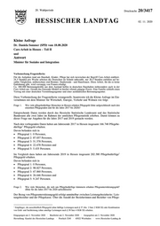 "content": "20. Wahlperiode Drucksache 20/3417 HESSISCHER LANDTAG 02. 11. 2020 Kleine Anfrage Dr. Daniela Sommer (SPD) vom 18.08.2020 Care-Arbeit in Hessen – Teil II und Antwort Minister für Soziales und Integration Vorbemerkung Fragestellerin: Für die Aufgaben rund um Haushalt, Kinder, Pflege hat sich inzwischen der Begriff Care-Arbeit etabliert. 24,5 Stunden pro Woche arbeiten die Deutschen im Schnitt unbezahlt, nur 20,5 Stunden entfallen auf be- zahlte Tätigkeiten, mitberechnet sind Rentner, Studierende - und Hausfrauen. Diese Arbeit, für die es keine Entlohnung gibt, wird vorrangig von Frauen erledigt. Ca. 300.000 Betreuungskräfte aus dem Ausland helfen in deutschen Haushalten insbesondere auch in der Care-Arbeit aus. Gerade das Entsende-Modell ist hierbei oftmals gängige Praxis: Eine Familie schließt einen Vertrag mit einer deutschen Vermittlungsagentur und einer ausländischen Betreuungsagentur. Diese Vorbemerkung der Fragestellerin vorangestellt, beantworte ich die Kleine Anfrage im Ein- vernehmen mit dem Minister für Wirtschaft, Energie, Verkehr und Wohnen wie folgt: Frage 1. Wie viele pflegebedürftige Menschen in Hessen erhalten Pflegegeld (bitte aufgeschlüsselt nach den einzelnen Pflegegraden und für die Jahre 2017 bis 2020)? Entsprechende Daten werden durch das Hessische Statistische Landesamt und das Statistische Bundesamt alle zwei Jahre im Rahmen der amtlichen Pflegestatistik erhoben. Damit können zu dieser Frage nur Angaben für die Jahre 2017 und 2019 gemacht werden. Nach den vorliegenden Daten haben am Jahresende 2017 in Hessen insgesamt 166.748 Pflegebe- 1 dürftige Pflegegeld erhalten. Davon befanden sich in Pflegegrad 1: 0 Personen, Pflegegrad 2: 87.057 Personen, Pflegegrad 3: 51.578 Personen, Pflegegrad 4: 22.678 Personen und Pflegegrad 5: 5.435 Personen. 1 Im Vergleich dazu haben am Jahresende 2019 in Hessen insgesamt 202.580 Pflegebedürftige Pflegegeld erhalten. Davon befanden sich in Pflegegrad 1: 0 Personen, Pflegegrad 2: 98.827 Personen, Pflegegrad 3: 67.860 Personen, Pflegegrad 4: 26.646 Personen und Pflegegrad 5: 9.247 Personen. Frage 2. Wie viele Menschen, die sich um Pflegebedürftige kümmern erhalten Pflegeunterstützungsgeld? (Bitte für die Jahre 2017 bis 2020 aufschlüsseln) Der Bezug von Pflegeunterstützungsgeld erfolgt unmittelbar zwischen Leistungsbezieherin / Leis- tungsbezieher und der Pflegekasse. Über die Anzahl der Bezieherinnen und Bezieher von Pflege- _____________________________ 1 Empfänger, die ausschließlich Pflegegeld (ohne hälftige Leistungen nach § 37 Abs. 2 Satz 2 SGB XI) oder Kombination von Geld- und Sachleistung (ohne anteilige Leistungen nach § 38 Satz 4 SGB XI) erhalten. Eingegangen am 2. November 2020 · Bearbeitet am 2. November 2020 · Ausgegeben am 2. November 2020 Herstellung: Kanzlei des Hessischen Landtags · Postfach 3240 · 65022 Wiesbaden · www.Hessischer-Landtag.de",