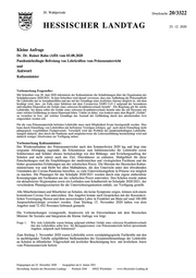 "content": "20. Wahlperiode Drucksache 20/3322 HESSISCHER LANDTAG 23. 12. 2020 Kleine Anfrage Dr. Dr. Rainer Rahn (AfD) vom 03.08.2020 Pandemiebedingte Befreiung von Lehrkräften vom Präsenzunterricht und Antwort Kultusminister Vorbemerkung Fragesteller: Mit Schreiben vom 30. Juni 2020 informierte der Kultusminister die Schulleitungen über die Organisation des Schuljahresstarts 2020/2021. In dem Schreiben wird darauf verwiesen, dass eine Aufhebung der Präsenzpflicht für Lehrkräfte nur in Ausnahmefällen und nur auf der Grundlage eines ärztlichen Attestes möglich ist, mit dem bestätigt wird, dass „im Falle einer Infektion mit dem Coronavirus SARS CoV-2 aufgrund der besonderen individuellen Disposition die Gefahr eines schweren Krankheitsverlaufs besteht“. Die Regelung gilt für solche Lehrkräfte, bei denen selbst die Gefahr eines schweren Krankheitsverlaufs besteht oder die mit Personen mit einer solchen Gefährdung in einem Hausstand leben. Unklar ist dabei, was konkret unter dem Begriff „Gefahr“ zu verstehen ist bzw. auf welcher Grundlage das Ausmaß der Gefährdung durch den attestierenden Arzt eingeschätzt werden soll. Für die vom Präsenzunterricht befreiten Lehrkräfte muss nach Möglichkeit Ersatz bereitgestellt werden. Dies kann durch Einstellung von Lehrkräften mit befristeten Verträgen erfolgen, ggf. auch durch Einstellung nicht pädagogisch vorgebildeten Fachpersonals. Verschärft wird das Problem des pandemiebedingten Lehrkräfte- mangels dadurch, dass durch die Pandemie auch möglicherweise die Lehrerausbildung beeinträchtigt wird und dadurch weniger Absolventen zur Verfügung stehen. Vorbemerkung Kultusminister: Der Wiederaufnahme des Präsenzunterrichts nach den Sommerferien 2020 lag und liegt eine sorgsame Abwägung zugrunde, die Erkenntnisse zum Infektionsrisiko für Lehrkräfte sowie Schülerinnen und Schüler ebenso berücksichtigt wie den Bildungs- und Erziehungsauftrag der Schulen und nicht zuletzt auch das Ziel, Elternhäuser zu entlasten. Maßgeblich für diese Entscheidungen sind die Empfehlungen der medizinischen und virologischen Fachleute und die bisher gesammelten Erfahrungen aus der schulischen Praxis. Die Maxime des Hessischen Kultus- ministeriums war und bleibt bei allen Maßnahmen, die den Unterricht unter den obwaltenden Umständen der Corona-Pandemie betreffen, so viele Unterrichtsangebote in Präsenz wie möglich zu machen. Die Planungen für das Schuljahr 2020/2021 wurden durch eine eigens einberufene Konzeptgruppe mit Fachleuten aus der schulischen Praxis unterstützt. Den Schulen wurde zudem ein aktualisierter Hygieneplan sowie ein Leitfaden zum Schulbetrieb im Schuljahr 2020/2021, der verschiedene Planungsszenarien für die Unterrichtsorganisation enthält, zur Verfügung gestellt. Alle Mitarbeiterinnen und Mitarbeiter an Schulen, die keine Symptome zeigen, können sich einem kostenlosen Corona-Test unterziehen. Das Angebot konnte nach Gesprächen mit der Kassenärzt- lichen Vereinigung Hessen und dem auswertenden Labor in Frankfurt am Main auf rund 100.000 Anspruchsberechtigte erweitert werden. Zum Stichtag 13. November 2020 haben von dem Angebot rund 72.452 Personen Gebrauch gemacht. Die Vorbemerkungen vorangestellt, beantworte ich im Einvernehmen mit dem Hessischen Minister für Soziales und Integration die Kleine Anfrage wie folgt: Frage 1. Wie viele Lehrkräfte waren bislang aufgrund erhöhter Gefahr eines schweren Krankheitsverlaufs (bei den Lehrkräften selbst bzw. bei Bezugspersonen) vom Präsenzunterricht befreit (prozentuale Angaben, aufgeteilt nach Schularten)? Zum Stichtag 2. November 2020 waren Lehrkräfte sowie sozialpädagogische Fachkräfte mit den in nachfolgender Tabelle aufgeführten Stellenanteilen des Gesamtstellenumfangs der Lehrkräfte an Schulen in öffentlicher Trägerschaft mit ärztlicher Bescheinigung bzw. mit ärztlichem Attest vom Präsenzunterricht befreit: Eingegangen am 23. Dezember 2020 · Ausgegeben am 6. Januar 2021 Herstellung: Kanzlei des Hessischen Landtags · Postfach 3240 · 65022 Wiesbaden · www.Hessischer-Landtag.de",