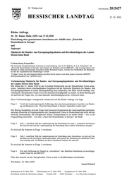 "content": "20. Wahlperiode Drucksache 20/2427 HESSISCHER LANDTAG 25. 03. 2020 Kleine Anfrage Dr. Dr. Rainer Rahn (AfD) vom 17.02.2020 Einrichtung eines gemeinsamen Ausschusses zur Abhilfe einer „Passivität Deutschlands in Europa“ und Antwort Ministerin für Bundes- und Europaangelegenheiten und Bevollmächtigten des Landes Hessen beim Bund Vorbemerkung Fragesteller: Die hessische Europaministerin kritisierte in einem Beitrag vom 31.01.2020 in „F.A.Z.-Einspruch“ die „Passivität Deutschlands in Europa“ und forderte als Reaktion auf den BREXIT: „Die Lösung könnte zum Beispiel in einem gemeinsamen Ausschuss beider Kammern liegen, welcher die Fachlichkeit des Bundesra- tes mit der Legitimation des Bundestages vereint“ https://www.faz.net/einspruch/lehren-aus-dem-brexit-keiner-wird-ohne-grund-verlassen-16608397. html?premium&service=printPreview). Vorbemerkung Ministerin für Bundes- und Europaangelegenheiten und Bevollmächtigten des Landes Hessen beim Bund: Mit Ablauf des 31. Januar 2020 ist das Vereinigte Königreiche aus der Europäischen Union ausge- treten. Anlässlich dieses einschneidenden Ereignisses hat die Hessische Ministerin für Bundes- und Europaangelegenheiten in einem Meinungsbeitrag dazu aufgerufen, den Blick auf die künftige Aus- richtung der Europäischen Union sowie der deutschen Europapolitik zu richten. In ihrem Beitrag geht sie auch auf die Fragen ein, wie man nationale Entscheidungsprozesse verbessern kann. Diese Vorbemerkungen vorangestellt, beantworte ich die Kleine Anfrage wie folgt: Frage 1. Vertritt die Landesregierung die Auffassung, dass mit einem gemeinsamen Ausschuss von Bundes- tag und Bundesrat einer „Passivität Deutschlands in Europa“ abgeholfen werden kann? Der Beitrag beschäftigt sich mit Frage einer besseren Organisation der innerstaatlichen parlamen- tarischen Kontrolle in Angelegenheiten der Europäischen Union in Deutschland und nicht mit der Aktivität Deutschlands auf europäischer Ebene. Entsprechend ist an keiner Stelle – wie es die Fragestellung unterstellt - von einer „Passivität Deutschlands in Europa“ die Rede. Frage 2. Falls 1. zutreffend: hält die Landesregierung die Einrichtung des unter 1. genannten Ausschusses für sinnvoll und wird die Landesregierung die Einrichtung eines solchen Ausschusses anregen? Es wird auf die Antwort zu Frage 1 verwiesen. Frage 3. Falls 2. zutreffend: Hält die Landesregierung die Einrichtung eines Ausschusses, an dem auf Län- derebene nur die jeweiligen Landesregierungen, nicht jedoch das Parlament mit sämtlichen Frakti- onen beteiligt sind, im Hinblick auf dessen intendierte Funktion für sinnvoll? Es wird auf die Antwort zu Frage 1 verwiesen. Frage 4. War nach Auffassung der Mangel an „Ausschüssen“ oder ähnlichen Institutionen ein ausschlagge- bender Grund für den BREXIT? Über den Austritt aus der Europäischen Union wurde in Großbritannien entschieden. Wiesbaden, 23. März 2020 Lucia Puttrich Eingegangen am 25. März 2020 · Eilausfertigung am 25. März 2020 · Ausgegeben am 27. März 2020 Herstellung: Kanzlei des Hessischen Landtags · Postfach 3240 · 65022 Wiesbaden · www.Hessischer-Landtag.de",