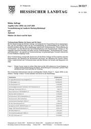 "content": "20. Wahlperiode Drucksache 20/3217 HESSISCHER LANDTAG 06. 10. 2020 Kleine Anfrage Angelika Löber (SPD) vom 14.07.2020 Vereinsförderung im Landkreis Marburg-Biedenkopf und Antwort Minister des Innern und für Sport Vorbemerkung Minister des Innern und für Sport: Bei der Beantwortung der Kleinen Anfrage wird aufgrund der Fragestellung davon ausgegangen, dass sich die jeweiligen Fragen auf die Vereinsförderung im Zusammenhang mit Corona-Ver- einshilfe beziehen und das davon unabhängige unbefristete Förderprogramm „Weiterführung der Vereinsarbeit“ aus dem Bereich der Sportstättenförderung nicht Gegenstand der Anfrage ist. Die folgenden Antworten beziehen sich daher auf das Förderprogramm „Weiterführung der Vereins- und Kulturarbeit“, das speziell zur Existenzsicherung von gemeinnützigen Vereinen während der Corona-Pandemie aufgelegt wurde. Diese Vorbemerkung vorangestellt, beantworte ich die Kleine Anfrage im Einvernehmen mit dem Kultusminister, der Ministerin für Wissenschaft und Kunst, der Ministerin für Umwelt, Klima- schutz, Landwirtschaft und Verbraucherschutz und dem Minister für Soziales und Integration wie folgt: Frage 1. Welche Vereine wurden in welcher Höhe bisher im Jahr 2020 während der Corona-Pandemie im Landkreis Marburg-Biedenkopf aus den Mitteln „Weiterführung der Vereinsarbeit“ gefördert? Bitte aufschlüsseln nach Verein und Höhe der Förderung. Die erwünschten Informationen sind der nachfolgenden Tabelle (Stand 17. August 2020) zu ent- nehmen. Anträge weiterer Vereine befinden sich derzeit in der Bearbeitung. Vereinsname Fördersumme EC-Jugendfreizeitheim Haus Bergfried e.V. 10.000,00 € FC Oberwalgern e.V. 10.000,00 € FSV Sterzhausen e.V. 1.243,00 € Interessengemeinschaft Frankreich 1975 Hartenrord e.V. 2.815,00 € Marburger Tennisclub 1912 e.V. 510,77 € Rasen-Sportverein 1924 Roßdorf e.V. 4.992,16 € Reitclub 2002 Kirchhain e.V. 3.745,60 € Schützenverein 1925 Großseelheim e.V. 2.409,26 € Schützenverein 1932 Schlierbach 3.117,75 € Schützenverein Bauerbach 1956 e.V. 128,21 € SG 1912 Mornshausen/S e.V. 2.330,67 € Sportgemeinschaft 1920/30 Rosphe e.V. 8.007,94 € Spvgg. 1930 Rauischholzhausen e.V. 3.926,37 € SSV Allna-Ohetal e.V. 7.871,36 € Tennisclub Schwabendorf 1986 e.V. 1.330,00 € TSV 1911 Elnhausen e.V. 5.515,86 € Eingegangen am 6. Oktober 2020 · Bearbeitet am 6. Oktober 2020 · Ausgegeben am 8. Oktober 2020 Herstellung: Kanzlei des Hessischen Landtags · Postfach 3240 · 65022 Wiesbaden · www.Hessischer-Landtag.de",