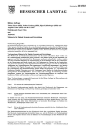 "content": "20. Wahlperiode Drucksache 20/1503 HESSISCHER LANDTAG 27. 12. 2019 Kleine Anfrage Tobias Eckert (SPD), Nadine Gersberg (SPD), Bijan Kaffenberger (SPD) und Angelika Löber (SPD) vom 06.11.2019 Modellprojekt Smart Cities und Antwort Ministerin für Digitale Strategie und Entwicklung Vorbemerkung Fragesteller: Das Bundesinnenministerium hat im September für 13 ausgewählte Kommunen das „Modellprojekte Smart Cities“ gestartet. Ziel dieses Projektes ist es, dass Kommunen unterstützt werden sollen, die Chancen der Di- gitalisierung zu erkennen und sich den daraus folgenden Herausforderungen strategisch zu stellen. Der breite Wissenstransfer soll mit insgesamt 750 Mio. € gefördert werden. Für hessische Kommunen ist das Ergebnis enttäuschend ausgefallen, da sie leer ausgegangen sind. Vorbemerkung Ministerin für Digitale Strategie und Entwicklung: Der Wettbewerb des Bundesinnenministeriums und die damit verbundenen Ziele werden von der Landesregierung grundsätzlich positiv bewertet, weil dadurch nicht nur das bestehende En- gagement und die Innovationskraft der Kommunen anerkannt und gefördert werden, sondern auch die wachsende Bedeutung der Digitalisierung für die Kommunen und für die Lebensquali- tät der Bürgerinnen und Bürger betont wird. Der Bedeutung des Themas hat die Landesregie- rung durch die Ernennung einer Digitalministerin Rechnung getragen und mit der inhaltlichen Ausprägung des Tätigkeitsbereichs eine bundesweite Vorreiterrolle übernommen. Der Bereich der Ministerin für Digitale Strategie und Entwicklung widmet sich in besonderem Maße auch der Unterstützung und Weiterentwicklung smarter Städte und Regionen, u.a. im Rahmen des Fachbeirats Digitale Pilotregion sowie der Fachgruppe Smart Region des länderübergreifenden Strategieforums FrankfurtRheinMain. Ziel ist dabei nicht vorrangig die Förderung einzelner Kommunen, sondern die Nutzbarmachung der Digitalisierungschancen für möglichst viele Landkreise, Städte und Gemeinden in Hessen und angrenzenden Regionen. Diese Vorbemerkungen vorangestellt beantworte ich die Kleine Anfrage im Einvernehmen mit dem Chef der Staatskanzlei wie folgt: Frage 1. Wie bewertet die Landesregierung den Wettbewerb? Die Hessische Landesregierung begrüßt, dass durch den Wettbewerb das Engagement von Kommunen zur Erprobung von Smart-City-Ansätzen gewürdigt und unterstützt wird. Frage 2. Welche hessischen Kommunen haben an der Ausschreibung zum „Modellprojekt Smart Cities“ teilgenommen? Es handelt sich um einen vom Bundesinnenministerium initiierten Wettbewerb. Dementspre- chend richteten sich die Wettbewerbsbeiträge unmittelbar an dieses Bundes-Ressort. Der Lan- desregierung liegen daher keine Informationen zu hessischen Bewerbungen im Rahmen des Wettbewerbs „Modellprojekt Smart Cities“ vor. Frage 3. Wie hat die Landesregierung die hessischen Kommunen zusätzlich über das „Modellprojekt Smart Cities“ informiert? Das Bundesinnenministerium hat den Wettbewerb breit über verschiedene Kanäle beworben. Die Hessische Landesregierung hat darüber hinaus u.a. auf der Webseite von Technologieland Hessen und Digitales Hessen sowie im Rahmen von Veranstaltungen auf den Wettbewerb hin- gewiesen. Eingegangen am 27. Dezember 2019 · Bearbeitet am 6. Januar 2020 · Ausgegeben am 9. Januar 2020 Herstellung: Kanzlei des Hessischen Landtags · Postfach 3240 · 65022 Wiesbaden · www.Hessischer-Landtag.de",