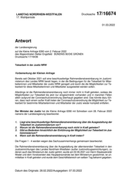 "content": "LANDTAG NORDRHEIN-WESTFALEN Drucksache 17/16674 17. Wahlperiode 01.03.2022 Antwort der Landesregierung auf die Kleine Anfrage 6390 vom 2. Februar 2022 des Abgeordneten Stefan Engstfeld BÜNDNIS 90/DIE GRÜNEN Drucksache 17/16436 Telearbeit in der Justiz NRW Vorbemerkung der Kleinen Anfrage Bereits seit Oktober 2021 soll eine beschlussfertige Rahmendienstvereinbarung im Justizmi- nisterium des Landes NRW bereit liegen, in der die Bedingungen für die Telearbeit für Mitar- beiterinnen und Mitarbeiter der Justiz NRW geregelt und durch die die Möglichkeiten zur Te- learbeit für diese Mitarbeiterinnen und Mitarbeiter ausgeweitet werden sollen. Allerdings ist die Rahmendienstvereinbarung noch immer nicht in Kraft getreten, sodass die Möglichkeiten zur Telearbeit bis jetzt nur eingeschränkt vorhanden und in manchen Fällen allein aufgrund der Coronaschutzverordnung überhaupt gegeben sind. Das könnte dazu füh- ren, dass nach einem außer Kraft treten der Coronaschutzverordnung die Möglichkeit zur Te- learbeit für bestimmte Mitarbeiterinnen und Mitarbeiter der Justiz wieder komplett entfallen. Der Minister der Justiz hat die Kleine Anfrage 6390 mit Schreiben vom 28. Februar 2022 namens der Landesregierung beantwortet. 1. Liegt eine beschlussfertige Rahmendienstvereinbarung über die Ausgestaltung der Telearbeit im Justizministerium vor? 2. Warum ist die Rahmendienstvereinbarung noch nicht in Kraft getreten? 3. Gibt es Bedenken hinsichtlich der Einführung der Möglichkeit zur Telearbeit im Jus- tizministerium? 4. Wann soll die Rahmendienstvereinbarung in Kraft treten? Die Fragen 1 - 4 werden wegen des Sachzusammenhangs gemeinsam beantwortet. Die Rahmendienstvereinbarung über die Ausgestaltung der alternierenden Telearbeit in den Justizeinrichtungen des Landes Nordrhein-Westfalen (außer Justizvollzugseinrichtungen), zu denen auch das Ministerium der Justiz gehört, wurde am 02.06.2021 von Herrn Staatssekretär Wedel und dem Vorsitzenden des Hauptpersonalrats bei dem Ministerium gezeichnet, ist un- mittelbar in Kraft getreten und wurde dem Geschäftsbereich am selben Tag bekannt gegeben. Datum des Originals: 28.02.2022/Ausgegeben: 07.03.2022",
