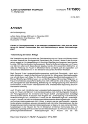"content": "LANDTAG NORDRHEIN-WESTFALEN Drucksache 17/15803 17. Wahlperiode 01.12.2021 Antwort der Landesregierung auf die Kleine Anfrage 6099 vom 04. November 2021 der Abgeordneten Anja Butschkau SPD Drucksache 17/15526 Frauen in Führungspositionen in den obersten Landesbehörden - Hält sich das Minis- terium für Heimat, Kommunales, Bau und Gleichstellung an seinen Gleichstellungs- plan? Vorbemerkung der Kleinen Anfrage Die Verwirklichung des Grundrechts der Gleichberechtigung von Frauen und Männern ist ein wichtiges Staatsziel der Bundesrepublik Deutschland, das in Artikel 3 Absatz 2 des Grundge- setzes geregelt ist. Um dieses Ziel auch in Nordrhein-Westfalen durchzusetzen, beschloss der Landtag 1999 das Landesgleichstellungsgesetz. Bestehende Benachteiligungen von Frauen und Männern sollen durch dieses Gesetz abgebaut werden. Eine wesentliche Maßnahme ist dabei die Förderung von Frauen im öffentlichen Dienst und damit auch der angestellten und verbeamteten Mitarbeiterinnen in den Ministerien des Landes Nordrhein-Westfalen. Nach Paragraf 5 des Landesgleichstellungsgesetzes erstellt jede Dienststelle - damit auch jedes Ministerium – jeweils für den Zeitraum von drei bis fünf Jahren einen Gleichstellungsplan und schreibt diesen nach Ablauf fort. Wenn die Zielvorgaben des Gleichstellungsplans im Hin- blick auf Einstellungen, Beförderungen von und die Übertragung höherwertiger Tätigkeiten an Frauen innerhalb des vorgesehenen Zeitraumes nicht erfüllt worden sind, ist bis zur Erfüllung der Zielvorgaben bei jeder Einstellung, Beförderung und Höhergruppierung eines Mannes in einem Bereich, in dem Frauen unterrepräsentiert sind, eine besondere Begründung durch die Dienststelle notwendig. Auch 22 Jahre nach Inkrafttreten des Landesgleichstellungsgesetzes ist die Gleichberechti- gung von Frauen und Männern in der Landesverwaltung noch nicht durchgesetzt. Gerade in den Führungspositionen der Ministerien sind Frauen deutlich unterrepräsentiert. So beträgt der Frauenanteil (Stand: 30.06.2021) nach Angaben der Landesregierung in der Antwort auf die Kleine Anfrage 5757 (Drucksache 17/14905) bei den Referatsleitungen der Landesregie- rung 43,0 Prozent, bei den Gruppenleitungen/stellvertretenden Abteilungsleitungen 33,1 Pro- zent und den Abteilungsleitungen 28,2 Prozent. In lediglich vier der zwölf obersten Landesbe- hörden arbeiten mindestens genauso viele weibliche wie männliche Referatsleitungen. Bei den Gruppenleitungen/stellvertretenden Abteilungsleitungen ist dies nur in zwei und bei den Abtei- lungsleitungen in drei Häusern der Fall. Im Ministerium für Heimat, Kommunales, Bau und Gleichstellung beträgt der Frauenanteil bei den Referatsleitungen 58,1 Prozent, bei den Grup- penleitungen/stellvertretenden Abteilungsleitungen 44,4 Prozent und bei den Datum des Originals: 01.12.2021/Ausgegeben: 07.12.2021",