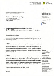 "content": "STAATSMINISTERIUM DER JUSTIZ UND FÜR DEMOKRATIE EUROPA UND GLEICHSTELLUNG 5 Freistaat SACHSEN Die Staatsministerin SACHSISCHES STAATSMINISTERIUM DER JUSTIZ UND FÜR Durchwahl DEMOKRATIE, EUROPA UND GLEICHSTELLUNG Telefon +49 351 564 15000 Hansastraße 4 | 01097 Dresden Telefax +49 351 564 15009 staatsministerin@ Präsidenten des Sächsischen Landtages smj.justiz.sachsen.de* Herrn Dr. Matthias Rößler Bernhard-von-Lindenau-Platz 1 Aktenzeichen (bitte bei Antwort angeben) 01067 Dresden 1 040E/46/998-LR zl Dresden. no,'tbozz Kleine Anfrage des Abgeordneten Ronald Pohle (CDU) Drs.-Nr.: 719470 Thema: Entwicklung der Verfahrensdauer an sächsischen Gerichten Sehr geehrter Herr Präsident, namens und im Auftrag der Sächsischen Staatsregierung beantworte ich die Kleine Anfrage wie folgt: ' Frage 1: Wie hat sich die Verfahrensdauer in der Zivil- und Strafgerichtsbarkeit in Sachsen im Zeitraum von 2017 bis 202t1 entwickelt? Bitte geben Sie die Verfahrensdauer im jeweiligen Kalenderjahr in Zivil- und Strafverfahren einerseits und auf die Ebenen Amtsgericht, Landgericht, Oberlandesge- Hausanschrift: Sächsisches Staatsministerium richt andererseits an. det Justiz und für Demokratie Europa und Gleichstellung Hansastraße 4 01097 Dresden Frage 2= www.justiz.sachsen.de/smj Wie hat sich die Verfahrensdauer in den übrigen Fachgerichtsbarkeiten in Verkehrsverbindung: Zu erreichen mit ÖPNV und Sachsen im Zeitraum von 2017 bis 2021 entwickelt? Bitte geben Sie die Fernverkehr (Bahnhof Neustadt) Parken und behinderten- Verfahrensdauer im jeweiligen Kalenderjahr aufgeschlüsselt in Verwal- gerechter Zugang über Einfahrt Hansastraße 4 tungs-, Arbeits-, Sozial- und Finanzgerichtsbarkeit einerseits und bei den Hinweise zum Datenschutz erhalten Sie aüf unserer lnternetseite. Auf drei ersteren Bereichen gegliedert in die beiden Ebenen andererseits an. Wunsch senden wir lhnen diese Hinweise auch zu. .Per E-Mail kein Zugang für elektronisch signierte sowie Zusammenfassende Antwort auf die Fragen 1 und 2: verschlüsselte elektronische - Nachrichten; nähere lnformationen zur elektronischen Kommunikation mit dem Sächsischen Staatsministerium der Justiz und für Demokratie, Europa und Gleichstellung unter httos://w. iustiz.sachsen.de/E- Seite 1 von 3 Kommunikation-SMJ",