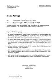 "content": "Sächsischer Landtag DRUCKSACHE 7/9995 7. Wahlperiode Kleine Anfrage des Abgeordneten Thomas Thumm, AfD-Fraktion Thema: Personalausgaben ZEFAS im ersten Quartal 2022 Vorab sei mitgeteilt, dass der Fragesteller einer Verlängerung der Beantwortungsfrist gemäß § 56 Absatz 5 der Geschäftsordnung des Landtages widerspricht. Fragen an die Staatsregierung: 1. In welcher Höhe wurden im ersten Quartal 2022 Entgelte für Beschäftigte aus dem Titel 07 26 / 428 01 ausgezahlt? (Bitte mit Angabe der Anzahl der Beschäftigten und jeweiliger Entgeltgruppe sowie Aufschlüsselung nach Monaten.) 2. In welcher Höhe wurden im ersten Quartal 2022 Entgelte für zusätzliche Beschäftigte in Projekten aus dem Titel 07 26 / 428 10 ausgezahlt? (Bitte mit Angabe der Anzahl der Beschäftigten und jeweiliger Entgeltgruppe sowie Aufschlüsselung nach Mona- ten.) 3. Welche konkreten Leistungen wurden für die im ersten Quartal 2022 ausgezahlten Entgelte (vgl. Frage 1 und 2) erbracht? 4. Wie viele und welche Unternehmen wurden im ersten Quartal 2022 im Freistaat Sach- sen vom ZEFAS bei der Fachkräftesicherung und der Fachkräftegewinnung unter- stützt bzw. begleitet? 5. Wie wurden die sächsischen Unternehmen im ersten Quartal 2022 bei der Fachkräf- tesicherung und der Fachkräftegewinnung vom ZEFAS unterstützt bzw. begleitet? Unterzeichner: Thomas Thumm Ort: Dresden Datum: 02.06.2022 Eingegangen am: 02.06.2022",