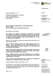 "content": "STAATSMlNlSTERlUM Freistaat FÜR KULTUS SACHSEN Der Staatsminister SÄCHSISCHES STAATSMINISTERIUM FÜR KULTUS Ihr Zeichen Postfach 100910101079 Dresden Präsidenten des Sächsischen Landtages Ihre Nachricht vom Herrn Dr. Matthias Rößler 21 . März 2022 Bernhard-von-Lindenau-Platz 1 Geschäftszeichen 01067 Dresden (bitte bei Antwort angeben) Z-1053/32/48 Dresden, A~ . April 2022 Kleine Anfrage des Abgeordneten Dr. Rolf Weigand (AfD) Drs.-Nr.: 7/9449 Thema: Aktionswoche Schule.Macht.Demokratie. Sehr geehrter Herr Präsident, MACH _ __ den Fragen sind folgende Ausführungen vorangestellt: „In einem WAS Schulleiterbrief informierte das Landesamt für Schule und Bildung am - WICHTIGES 3. Juni 2021 über die Aktionswoche Schule.Macht.Demokratie., welche Arbtittn im Öfftn llicht n Oit nst SaC'hstn im Rahmen des Internationalen Tages der Demokratie vom 13. bis 17. September 2021 stattfand.\" Namens und im Auftrag der Sächsischen Staatsregierung beantworte ich die Kleine Anfrage wie folgt: Frage 1: Wie viele Schulen führten ein schulspezifisches Projekt im Rahmen dieser Aktionswoche durch? (Bitte aufschlüsseln nach Schulart, LaSuB-Standort, Schule, Anbieter, Titel und Anzahl der durchgeführten Workshops) Frage 2: Wie viele der teilnehmenden Schulen bewarben sich um die in Ztrtiftklt scit2021 Aussicht gestellte Projektprämie von 500 Euro? (Bitte aufschlüsseln audit berufundfarrJlle nach Schulart, LaSuB-Standort und Schule) Frage 3: Welchen Schulen wurde die Projektprämie bis zum Stichtag 17. März 2022 bereits ausgezahlt? (Bitte aufschlüsseln nach Schulart, LaSuB-Standort und Schule) Frage 4: Gibt es antragstellende Schulen, welchen die Projektprämie Hausanschrift: verweigert wurde? Wenn ja, welchen und warum? Sächsisches Staatsministerium für Kultus Carolaplatz 1 Zusammenfassende Antwort auf die Fragen 1 bis 4: O1097 Dresden Die Anbieter und die Anzahl der Workshops werden nicht erfasst. Die www.smk.sachsen .de Teilnahme an der Aktionswoche erfolgt in Eigenverantwortung der Schule . Verkehrsverbindung: Der Staatsregierung liegen lediglich Angaben zu den mit einer Projektprämie Zu erreichen mit den Straßenbahnlinien 3, 7, 8 ausgestatteten Maßnahmen vor. Informationen zum Zugang für elektronisch signierte sowie für verschlüsselte elektronische Seite 1 von 2 Dokumente erhalten Sie unter www.smk.sachsen .de/kontakt.html",