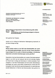 "content": "STAATSMINISTERIUM DER JUSTIZ UND FÜR DEMOKRATIE EUROPA UND GLEICHSTELLUNG l# Freistaat SACHSEN Die Staatsministerin SACHSISCHES STAATSMINISTERIUM DER JUSTIZ UND FÜR Durchwahl DEMOKRATIE, EUROPA UND GLEICHSTELLUNG Telefon +49 351 564 '15000 Hansastraße4 | 01097 Dresden Telefax +49 351 564 15009 staatsministerin@ Präsidenten des Sächsischen Landtages smj..iustiz.sachsen.de* Herrn Dr. Matthias Rößler Aktenzeichen Bernhard-von-Lindenau-Plaiz 1 (bitte bei Antwort angeben) 01067 Dresden 1040E/46/992-LR Dresden, ( Aprit2022 Kleine Anfrage der Abgeordneten Antonia Mertsching (DlE LINKE) Drs.-Nr.: 719433 Thema: Gleichstellung und Geschlechtergerechtigkeit im Rahmen des Struktutwandels Sehr geehrter Herr Präsident, namens und im Auftrag der Sächsischen Staatsregierung beantworte ich die Kleine Anfrage wie folgt: Frage 1: Welche lnhalte wurden im Juni 2021 beim Bündnistreffen der Lausit- zer Gleichstellungsbeauftragten, das sich mit dem Thema Geschlech- tergerechtigkeit für die Lausitz im Wandel beschäftigte, in Senftenberg Hausanschrift: Sächsisches Staatsministerium liesprochen und welche Vereinbarungen wurden getroffen? der Justiz und für Demokratie, Europa und Gleichstellung Hansastraße 4 01097 Dresden Wesentlicher lnhalt des Bündnistreffens der Lausitzer Gleichstellungsbeauf- www. justiz.sachsen.de/smj tragten im Juni 2021 war der Austausch über den dort erstmalig vorgeleg- VerkehEverbindung: Zu erreichen mit ÖPNV und Fernverkehr (Bahnhof Neustadt) ten Entwurf des im Auftrag des Bündnisses im Vorfeld erarbeiteten Positi- Parken und behinderten- onspapiers ,,F wie Kraft: Positionspapier der Kommunalen Gleichstellungs- gerechter Zugang über Einfahrt Hansastraße 4 beauftragten der Lausitz\" sowie dessen Verabschiedung. Anhand des Posi- Hinweise zum Datenschutz erhalten Sie auf unserer lnternstseite. Auf tionspapiers fordert das Bündnis geschlechtergerechte und gleichstellungs- Wunsch ssnden wir lhnen diese Hinweise auch zu. sensible Maßnahmen im Rahmen des Struktunrvandels. Dazu gehören ins- \"Per E-Mail kein Zugang für elsktronisch signierte sowie verschlüsselte slektronische Nachrichten; nähere lnformätionen zur elektronischen Kommunikation mit dem Sächsischon Staatsministorium der Justiz und für Demokratie, Europa und Gleichstellung untst httos://w. iustiz. sachsen.de/E- Seite 1 von 3 Kommunikation-SMJ",