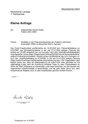 "content": "DRUCKSACHE 7/9973 Sächsischer Landtag 7. Wahlperiode Kleine Anfrage der Abgeordneten Kerstin Köditz Fraktion DIE LINKE Thema: Straftaten in den Phänomenbereichen der „Politisch motivierten Kriminalität“ (PMK) im Monat Mai 2022 in Sachsen Das Portal FragDenStaat veröffentlichte am 10.05.2022 den „Themenfeldkatalog zur KTA-PMK“ des Bundeskriminalamts in der seit 01.01.2022 gültigen Fassung, der bislang als VS-NfD eingestuft war und nunmehr nach dem Informationsfreiheitsgesetz herausgegeben wurde (https://fragdenstaat.de/blog/2022/05/10/pmk-themenfeldkatalog- politisch-motivierte-kriminalitat/). Darüber hinaus veröffentlichte das LKA Thüringen u.a. auch den „Angriffszielkatalog zur KTA-PMK“ in der seit 01.01.2022 gültigen Fassung (https://polizei.thueringen.de/tlka/statistik-pks/erlaeuterung-pks) Die Fragestellerin geht folglich davon aus, dass die Staatsregierung ab sofort nicht mehr gehindert ist, die regelmäßige Frage nach der Zuordnung einzelner Taten zu allen Themenfeldern im Sinne der PMK umfassend zu beantworten, statt diese Antworten auf den Bereich der sogenannten Hasskriminalität zu beschränken; und sie geht weiter davon aus, dass entsprechende Angaben auch zu allen Angriffszielen gemacht werden können. — b.w. — Unterzeichner: MdL Kerstin Köditz Ort: Dresden Eingegangen am: 31.05.2022",