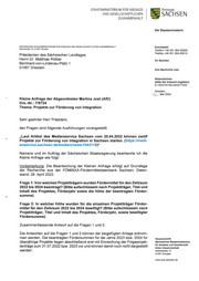 "content": "STAATSMlNlSTERlUM FÜR SOZlALES UND GESELLSCHAFTUCHEN ZUSAMMENHALT ij SACHsEN Die Staatsministerin SÄCHSISCHES STAATSMINISTERIUM FÜR SOZIALES UND GESELLSCHAFTLICHEN ZUSAMMENHALT Durchwahl Albertstraße 10 1 01097 Dresden Telefon +49 351 564-55000 Telefax +49 351 564-5501 0 Präsidenten des Sächsischen Landtages Herrn Dr. Matthias Rößler Ihr Zeichen Bernhard-von-Lindenau-Platz 1 01067 Dresden Ihre Nachricht vom Aktenzeichen (bitte bei Antwort angeben) Z-1053/70/190-2022/77 453 Dresden, A2_ . Mai2022 Kleine Anfrage der Abgeordneten Martina Jost (AfD) Drs.-Nr.: 7/9724 Thema: Projekte zur Förderung von Integration Sehr geehrter Herr Präsident, den Fragen sind folgende Ausführungen vorangestellt: „Laut Artikel des Medienservice Sachsen vom 20.04.2022 können zwölf Projekte zur Förderung von Integration in Sachsen starten. (https:l/medi- enservice.sachsen.de/medien/news/1043118)\" Namens und im Auftrag der Sächsischen Staatsregierung beantworte ich die Kleine Anfrage wie folgt: Vorbemerkung: Die Beantwortung der Kleinen Anfrage erfolgt auf Grundlage der Recherche aus der FÖMISAX-Fördermitteldatenbank Sachsen; Daten- stand: 28. April 2022. Frage 1: Von welchen Projektträgern wurden Fördermittel für den Zeitraum 2022 bis 2024 beantragt? (Bitte aufschlüsseln nach Projektträger, Titel und Inhalt des Projektes, Förderjahr sowie die Höhe der beantragten Förder- summe) Frage 2: In welcher Höhe wurden für die einzelnen Projektträger Förder- mittel für den Zeitraum 2022 bis 2024 bewilligt? (Bitte aufschlüsseln nach Projektträger, Titel und Inhalt des Projektes, Förderjahr, sowie bewilligter Fördersumme) Zusammenfassende Antwort auf die Fragen 1 und 2: Die Antworten auf die Fragen 1 und 2 können der beigefügten Anlage entnom- men werden. Die beantragten Fördersummen für die Jahre 2023 bzw. 2024 für Hausanschrift: überjährige Projekte liegen abschließend erst mit Einreichung der Folgeprojek- Sächsisches Staatsministerium für Soziales und Gesellschaft- tanträge zum 31.07.2022 bzw. 2023 vor und können damit noch nicht dargestellt lichen Zusammenhalt werden. Albertstraße 1o 01097 Dresden www.sms .sachsen.de",