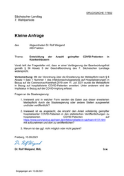 "content": "DRUCKSACHE 7/7652 Sächsischer Landtag 7. Wahlperiode Kleine Anfrage des Abgeordneten Dr. Rolf Weigand AfD-Fraktion Thema: Entwicklung der Anzahl geimpfter COVID-Patienten in Krankenhäusern Vorab teilt der Fragesteller mit, dass er einer Verlängerung der Beantwortungsfrist gemäß § 56 Absatz 5 der Geschäftsordnung des 7. Sächsischen Landtags widerspricht. Vorbemerkung: Mit der Verordnung über die Erweiterung der Meldepflicht nach § 6 Absatz 1 Satz 1 Nummer 1 des Infektionsschutzgesetzes auf Hospitalisierungen in Bezug auf die Coronavirus-Krankheit-2019 vom 11. Juli 2021 wurde die Meldepflicht in Bezug auf hospitalisierte COVID-Patienten erweitert. Unter anderem wird der Impfstatus in Bezug auf die COVID-Impfung erfasst. Fragen an die Staatsregierung: 1. Inwieweit und in welcher Form werden die Daten aus dieser erweiterten Meldepflicht durch die Staatsregierung oder andere Stellen ausgewertet und/oder veröffentlicht? 2. Inwieweit ist es angedacht, die Anzahl/ den Anteil vollständig geimpfter hospitalisierter COVID-Patienten in den statistischen Veröffentlichungen zu hospitalisierten COVID-Patienten auf https://www.coronavirus.sachsen.de/infektionsfaelle-in-sachsen-4151.html mit aufzunehmen und dort zu veröffentlichen? 3. Warum ist das ggf. nicht möglich oder nicht geplant? Freiberg, 15.09.2021 Dr. Rolf Weigand, MdL b.w. Eingegangen am: 15.09.2021",