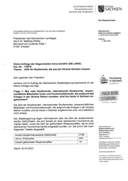 "content": "STAATSMINISTERIUM Freistaat FÜR WISSENSCHAFT SACHSEN KULTUR UND TOURISMUS Der Staatsminister STAATSMINISTERIUM FÜR WISSENSCHAFT. KULTUR UND TOURISMUS Aktenzeichen Postfach 10 09 20 | 01079 Dresden (bitte bei Antwort angeben) L-1053/18/29-2022/21462 Präsidenten des Sächsischen Landtages Dresden, Herrn Dr. Matthias Rößler 2. Mai 2022 Bernhard-von-Lindenau-Platz 1 01067 Dresden Kleine Anfrage der Abgeordneten Anna Gorskih (DIE LINKE) Drs.-Nr.: 7/9575 Thema: Hilfe für Studierende, die aus der Ukraine flüchten müssen Sehr geehrter Herr Präsident, Forschung in Sachsen. namens und im Auftrag der Sächsischen Staatsregierung beantworte ich die Exzellent. Kleine Anfrage wie folgt: Frage 1: Wie viele Studierende, internationale Studierende, wissen schaftliche Mitarbeiter:innen und Hochschullehrende, die aufgrund des Krieges in der Ukraine fliehen mussten, sind bis heute in Sachsen an gekommen? STUDIUM. Am besten in Sachsen. Die Zahl der Studierenden, internationalen Studierenden, wissenschaftlichen Mitarbeiter und Hochschullehrenden, die aufgrund des Krieges in der Ukraine fliehen mussten und bis heute in Sachsen angekommen sind, wird statistisch nicht erfasst. Der Staatsregierung liegen Informationen über die Zahl der studieninteres sierten Geflüchteten, die sich bereits an einer sächsischen Hochschule ge meldet haben, sowie die Zahl der geflüchteten Wissenschaftler, die an einer sächsischen Hochschule bereits eingestellt wurden, vor. Sie sind in der nach Besucheradresse: Staatsministerium für folgenden Tabelle dargestellt: Wissensctiaft, Kuitur und Tourismus 2799 Wigardstraße 17 Anzahl studieninteressierte Geflüchtete 01097 Dresden davon Drittstaatler 845 (Straßenbahnlinien 3, 6, 7, 8, 13) Anzahl geflüchtete Wissenschaftler 15 Parkplätze für Personen mit Be einträchtigungen finden Sie am barrierefreien hinteren Eingang, Zufahrt über Archivstraße. Stand: 20.04.2022 www.smwk.sachsen.de Informationen zum Datenschutz sowie zum Empfang elektronisch signierter und verschlüsselter Nachrichten finden Sie auf unserer Website.",