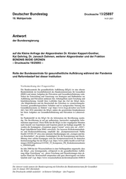 "content": "Deutscher Bundestag Drucksache 19/25897 19. Wahlperiode 14.01.2021 Antwort der Bundesregierung auf die Kleine Anfrage der Abgeordneten Dr. Kirsten Kappert-Gonther, Kai Gehring, Dr. Janosch Dahmen, weiterer Abgeordneter und der Fraktion BÜNDNIS 90/DIE GRÜNEN – Drucksache 19/25093 – Rolle der Bundeszentrale für gesundheitliche Aufklärung während der Pandemie und Reformbedarf bei dieser Institution Vorbemerkung der Fragesteller Die Bundeszentrale für gesundheitliche Aufklärung (BZgA) ist eine oberste Bundesbehörde im Geschäftsbereich des Bundesministeriums für Gesundheit (BMG) und nimmt Aufgaben der Prävention und Gesundheitsförderung wahr. Neben der Entwicklung und Umsetzung von Strategien und Maßnahmen zur Aufklärung und Prävention umfassen ihre Arbeitsgebiete auch Forschung und Qualitätssicherung. Gemäß ihres Leitbildes liegt das Ziel der BZgA darin, „die Möglichkeiten und die Bereitschaft des Einzelnen zu verantwortungsbe- wusstem, gesundheitsgerechtem Verhalten und zu sachgerechter Nutzung des Gesundheitssystems zu fördern“ (vgl. https://www.bzga.de/ueber-uns/leitb ild/). Seit 2016 unterstützt die BZgA zudem die gesetzlichen Krankenkassen bei ihren Aufgaben zur Gesundheitsförderung und Prävention in Lebenswel- ten. Im Pandemiefall ist die BZgA für die Information der Bevölkerung zustän- dig. Die Bevölkerung ist auf gut aufbereitete, barrierefrei zugängliche Infor- mationen angewiesen. Diese Rolle hat die BZgA in den vergangenen Monaten nach Ansicht von Expertinnen und Experten jedoch nur bedingt ausgefüllt. So wurden die Kampagnen „Zusammen gegen Corona“ sowie jene zur „AHA“- Regel federführend beim BMG entwickelt. Zur besseren Risikokommunikati- on und Risikosensibilisierung empfiehlt das „Kompetenznetzwerk Public Health COVID-19“ etwa eine nationale Dachkampagne mit „wenigen und kla- ren Botschaften“; die primäre Zuständigkeit für die Konzipierung und Durch- führung einer solchen Kampagne sieht das Kompetenznetzwerk im deutschen Institutionengefüge bei der BZgA (vgl. https://www.public-health-covid19.de/ images/2020/Ergebnisse/COVID_19_Kompetenz_PH_Risikokommunikatio n_25092020.pdf). Im Jahr 2008 hat der Wissenschaftsrat in einer Stellungnahme angemerkt, dass die BZgA „eine leistungsstarke, erfolgreich in der gesundheitlichen Aufklä- rung tätige Einrichtung“ sei, „deren Forschung und Dienstleistungen dem ak- tuellen Stand der Wissenschaft entsprechen und ganz überwiegend von hoher Qualität sind“ (vgl. https://www.wissenschaftsrat.de/download/archiv/8480-0 Die Antwort wurde namens der Bundesregierung mit Schreiben des Bundesministeriums für Gesundheit vom 14. Januar 2021 übermittelt. Die Drucksache enthält zusätzlich – in kleinerer Schrifttype – den Fragetext.",